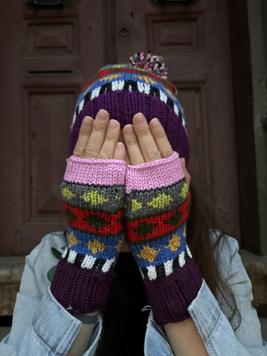 El Yapımı Renkli Bohem Bere Eldiven Takımı – Kışlık Örgü Desenli Kadın Bere- Mor Siyah