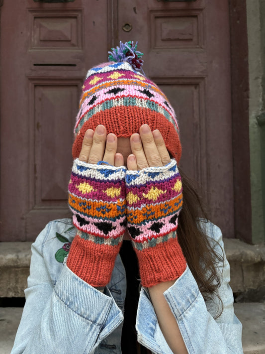 El Yapımı Renkli Bohem Bere Eldiven Takımı – Kışlık Örgü Desenli Kadın Bere- Kiremit