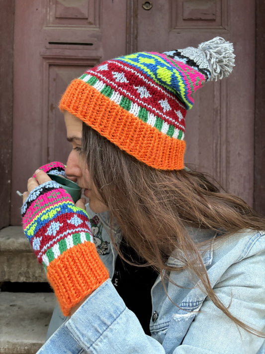 El Yapımı Renkli Bohem Bere Eldiven Takımı – Kışlık Örgü Desenli Kadın Bere- Turuncu