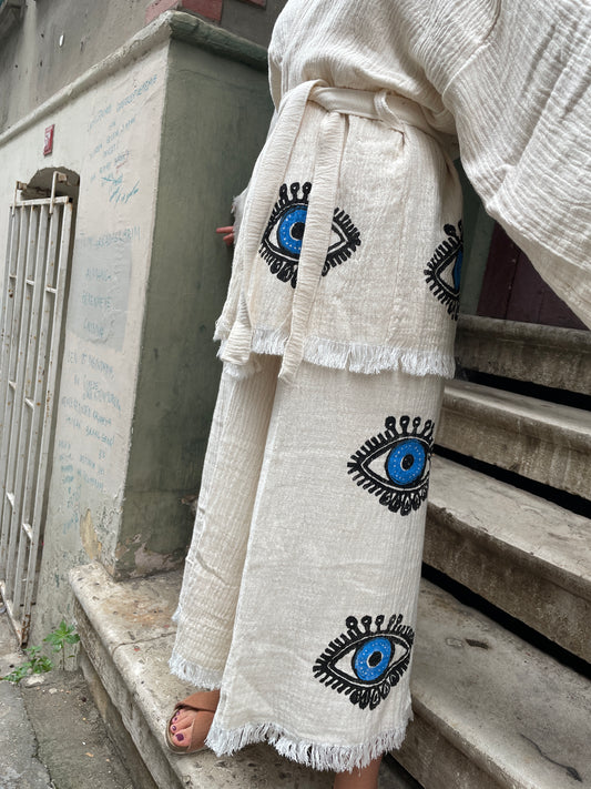 Göz Desenli Bohem Kadın Yoga Doğal Kumaş Kimono Takım Yoga Takımı