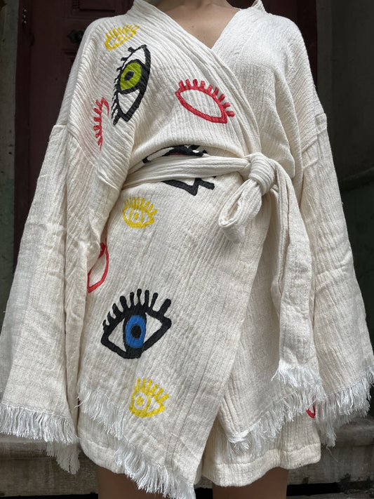 Göz Desenli Kadın Müslin Kimono Şort Takım