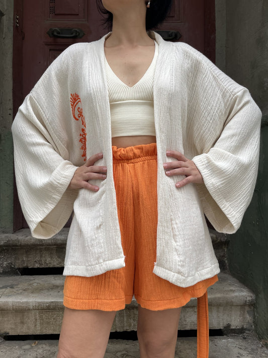 Güneş Desenli Turuncu Kadın Müslin Kimono Şort Takım