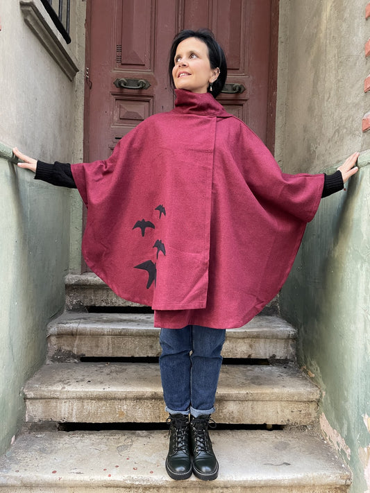 Kadın Bordo Bohem Kuşlu Panço Kaban Mont