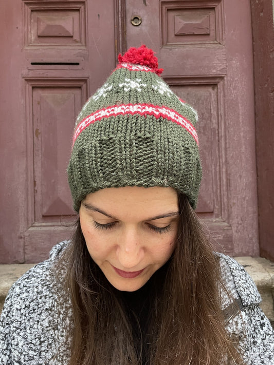 El Yapımı Renkli Bohem Bere Eldiven Takımı – Kışlık Örgü Desenli Kadın Bere- Kırmızı