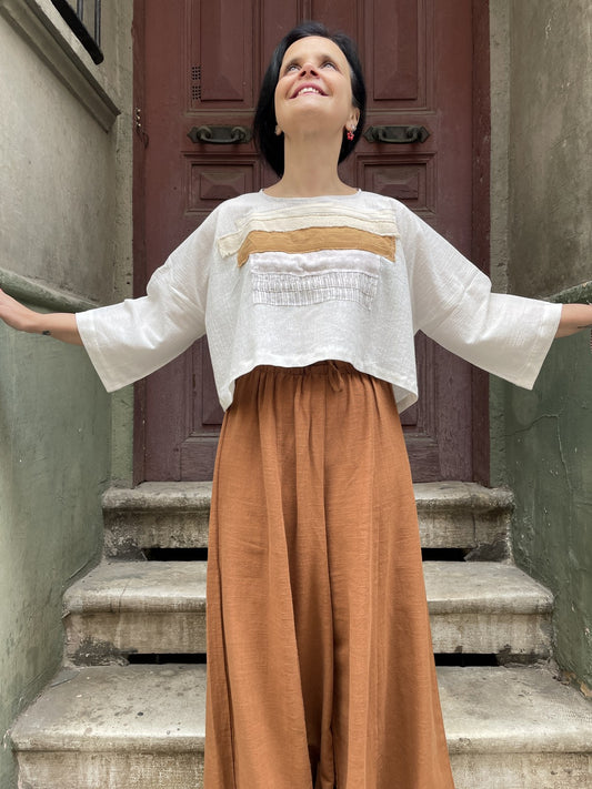 Batik Müslin Bluz – “Solara” | El Boyaması, Sıcak Renkli Bohem Tasarım