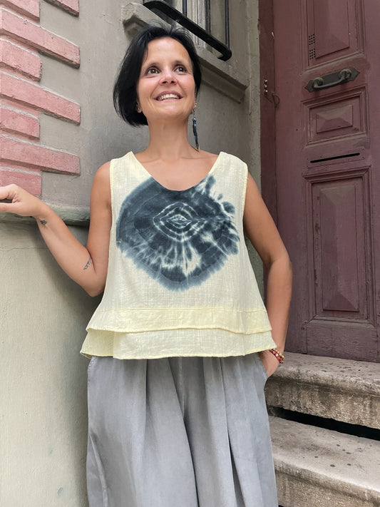 Bohem Batik Müslin Bluz – %100 Pamuk, Sarı Desenli