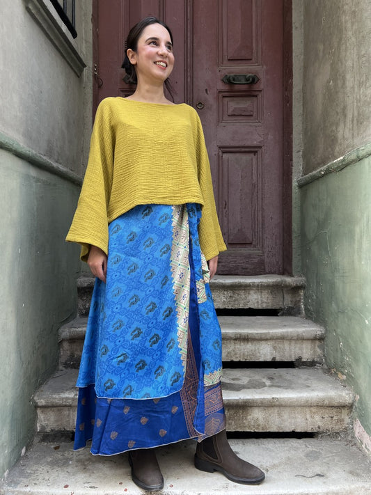 Nepal Çift Taraflı İpek Etek – Saks Mavi Desenli