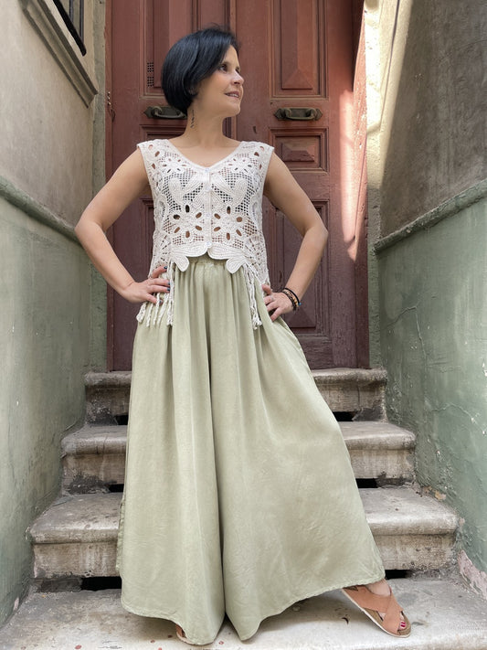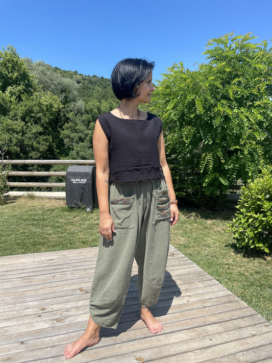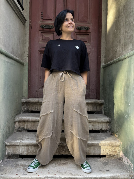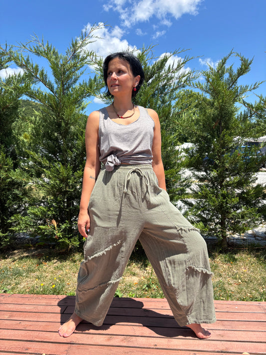 Bohem Kadın Bol Paça Pantolon – %100 Pamuk – Haki, Bej, Gri, Siyah, Kahve