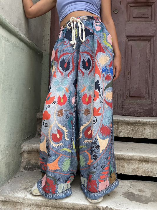 Bohem Kadın Jean Görünümlü Pantolon – Etnik Çiçek Motifli, Salaş Bol Paça