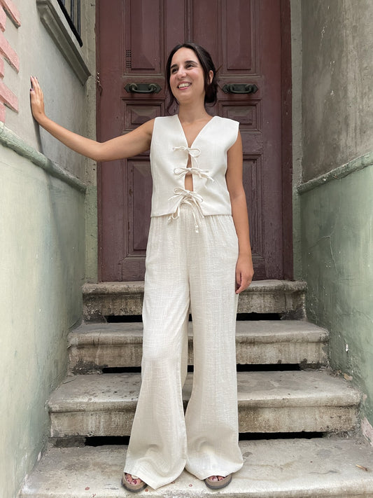 Kadın Bohem Düğmeli Pamuk Keten Yelek - Krem
