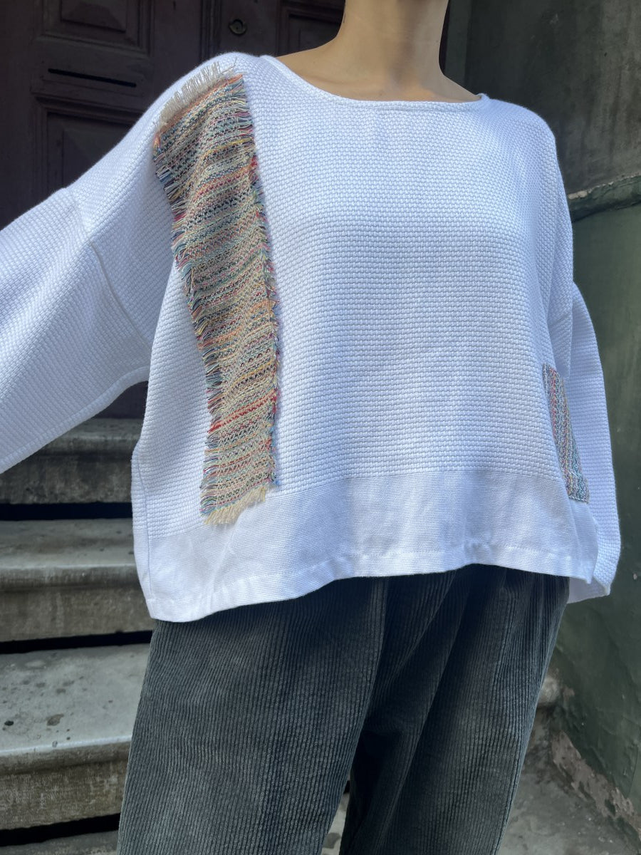 Göğüs kısmındaki renkli patchwork cep ve omuzdan aşağı doğru inen dokuma parça tasarıma karakter katar, böylece minimal ama güçlü bir stil ortaya çıkar.