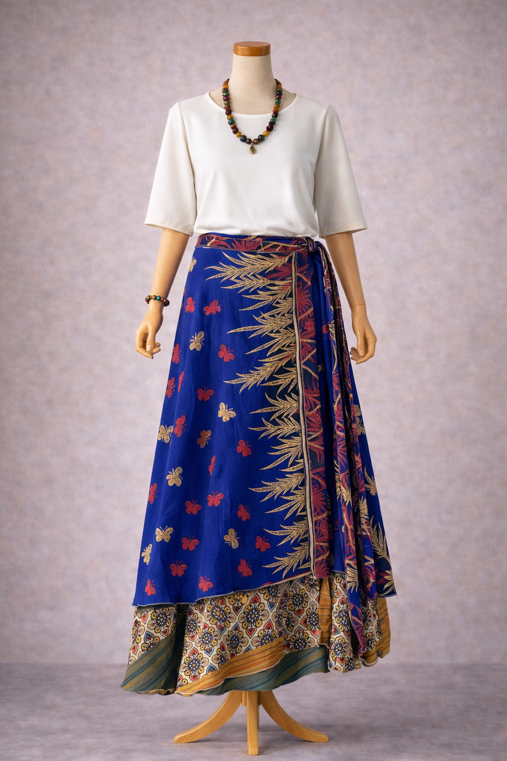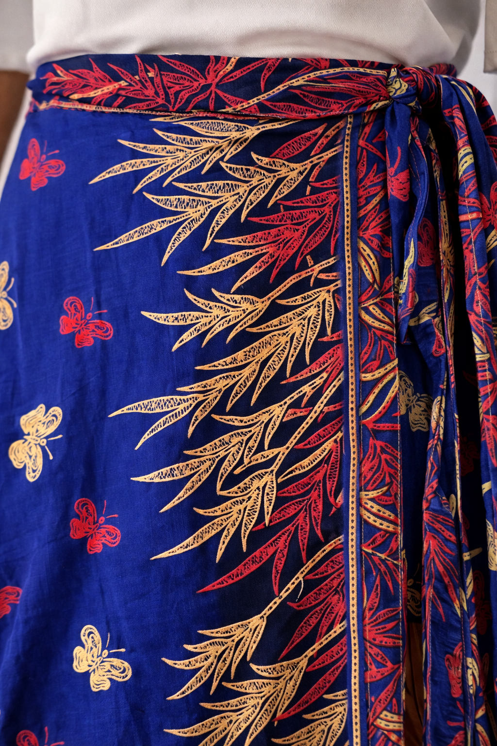 Çift Taraflı Bağlamalı İpek Etek – Mavi Kelebek Desenli (Nepal)