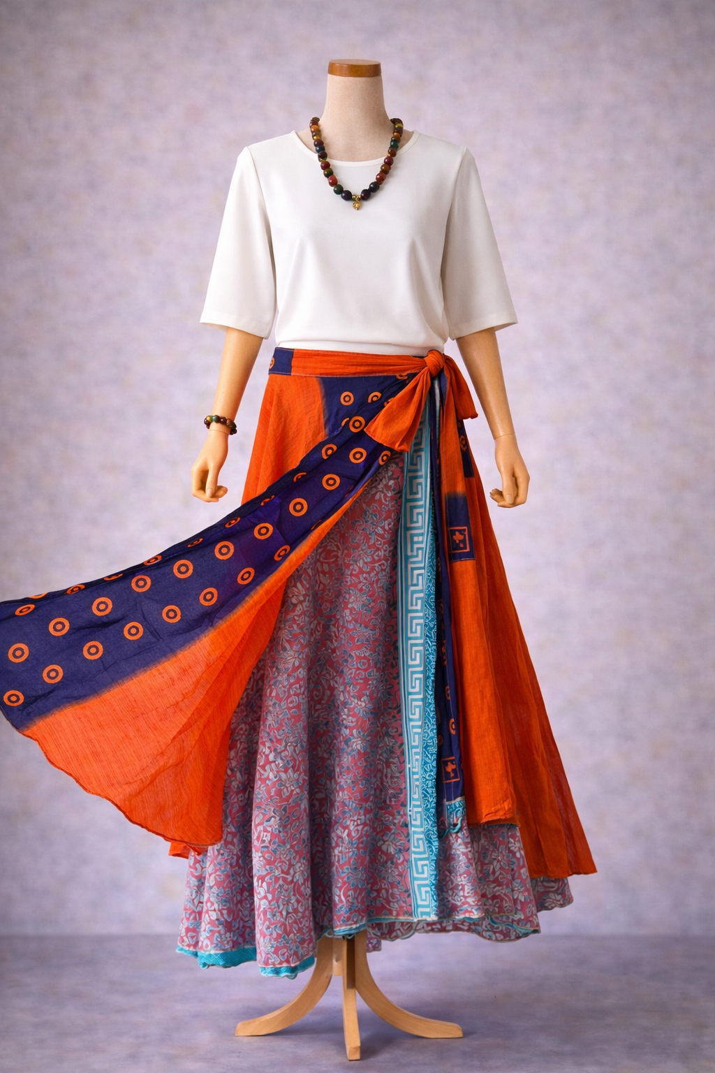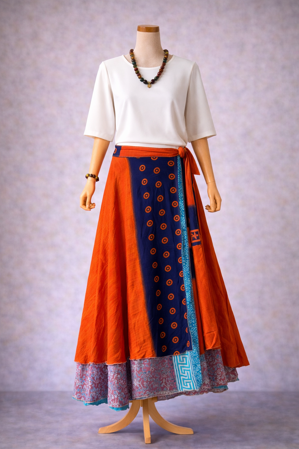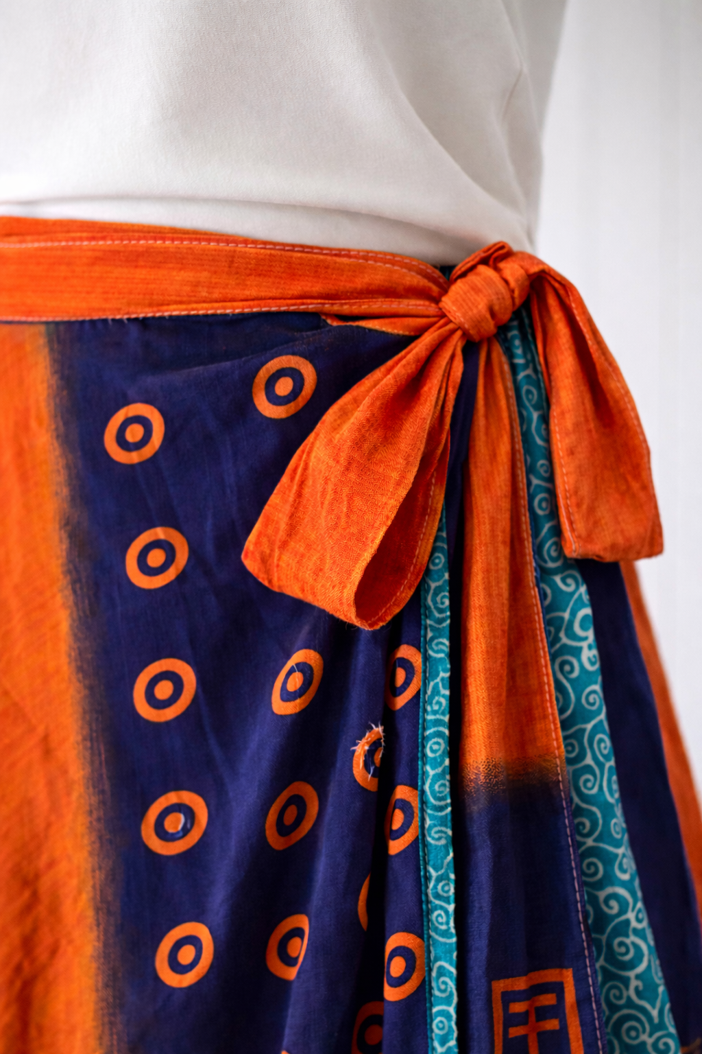 Turuncu lacivert detaylarıyla öne çıkan bu ipek etek, çift taraflı tasarımı sayesinde tek parçada iki farklı görünüm sunar. Bağlamalı bel yapısı, bedene göre ayarlanabilir konfor sağlar; dökümlü ve akışkan duruşu bohem stilin zamansız şıklığıyla buluşur. Nepal dokusunu taşıyan kumaşı, her kombinine özgün bir karakter katar.