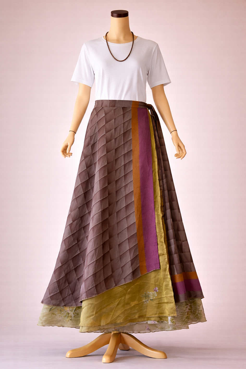 Etnik desenli bu bağlamalı ipek etek, etnik motiflerinin zarif kontrastıyla sakin ama güçlü bir bohem stil sunar. Wrap (sarım) formu belini kendi ölçüne göre ayarlarken; eteğin kenarındaki geometrik bordür şeritler ve alttan görünen patchwork katman, tasarıma derinlik ve hareket katar. Gün içinde minimal, akşamüstü aksesuarlarla daha iddialı—tek parçada birçok farklı ruh.