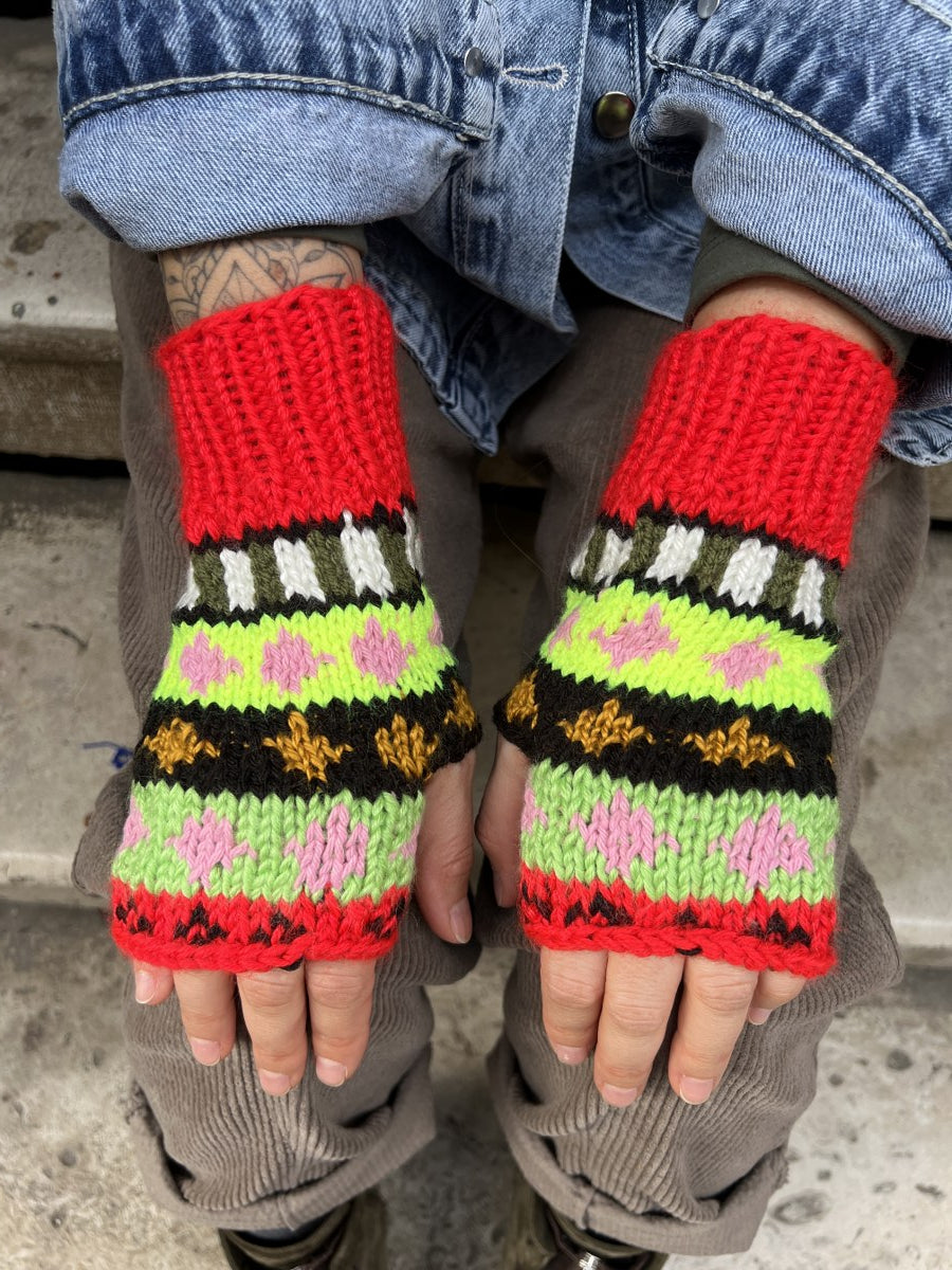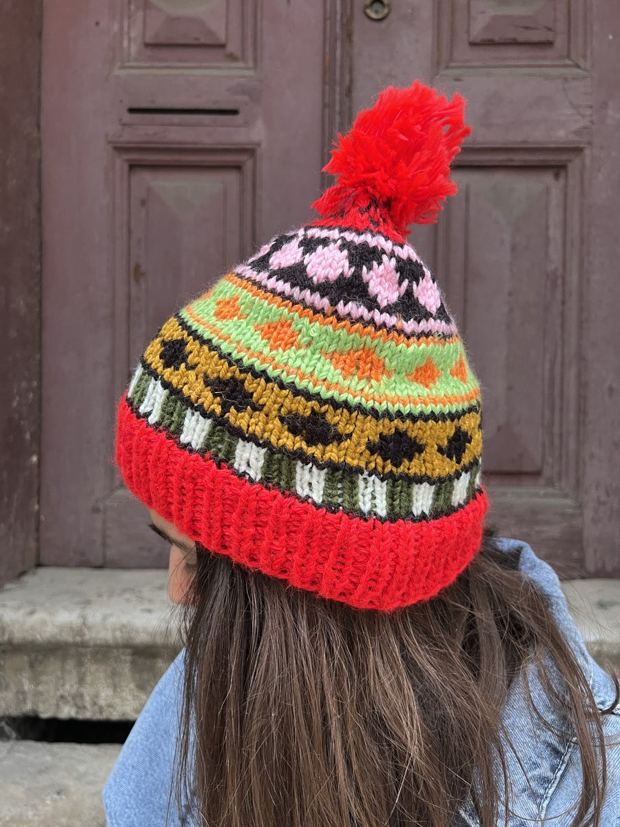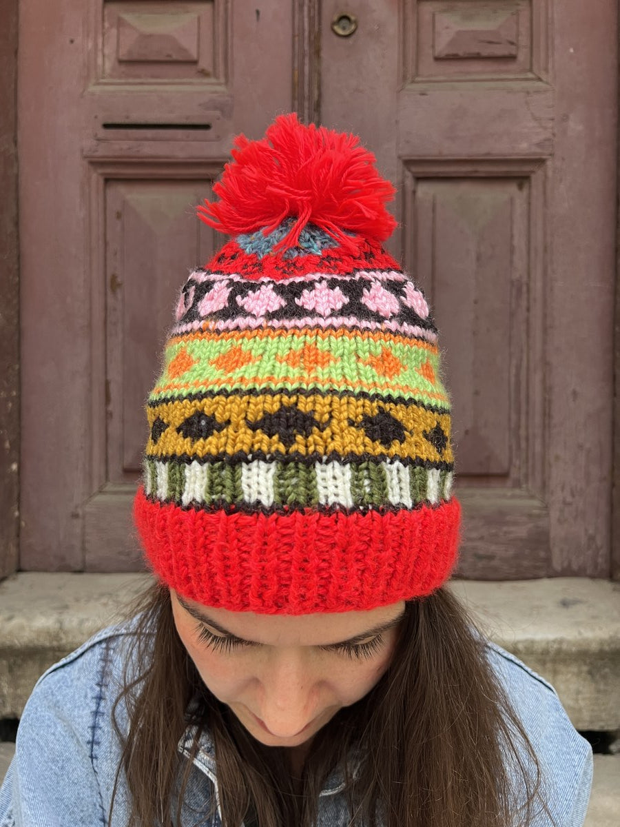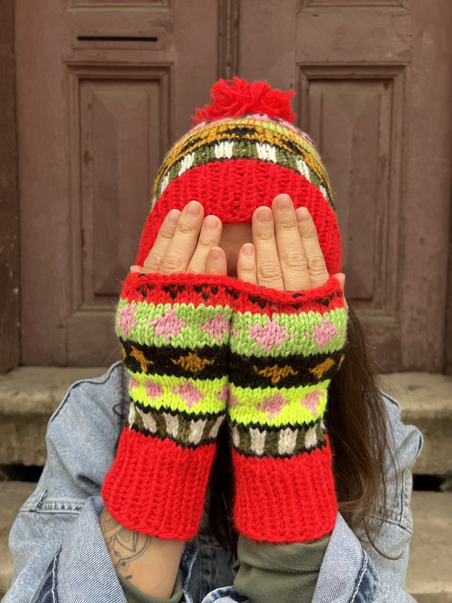 El Örgüsü Kadın Bere ve Eldiven Seti - Bohem Stil Renkli Kış Aksesuarı - Kırmızı Renkli