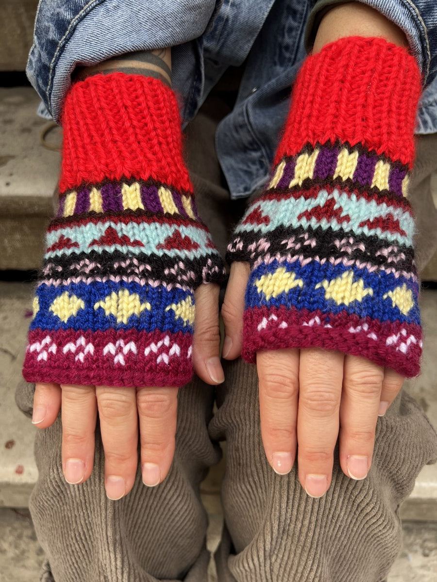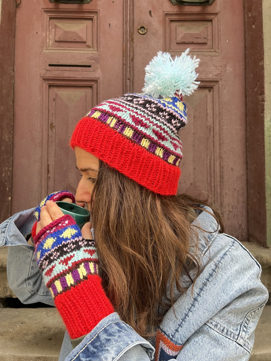 El Örgüsü Renkli Bere ve Parmaksız Eldiven Takımı - Kırmızı