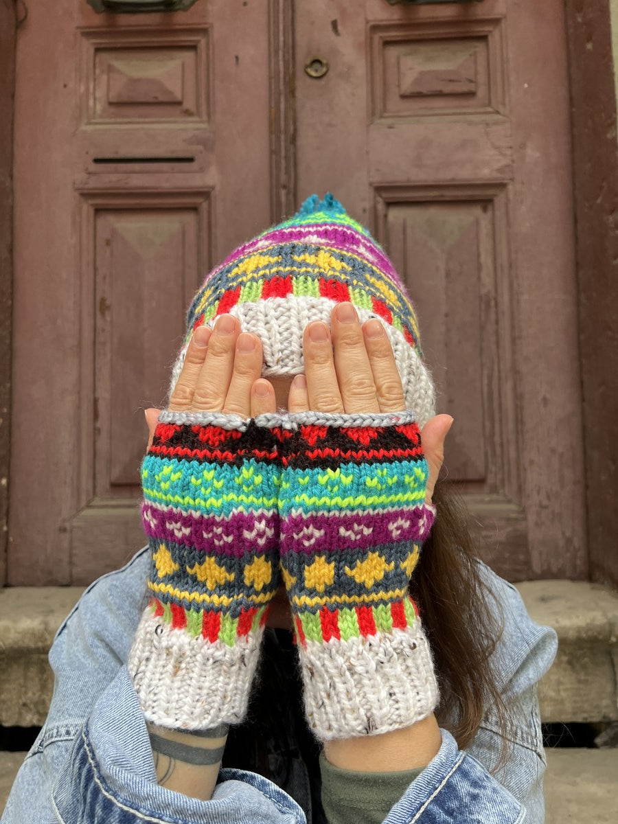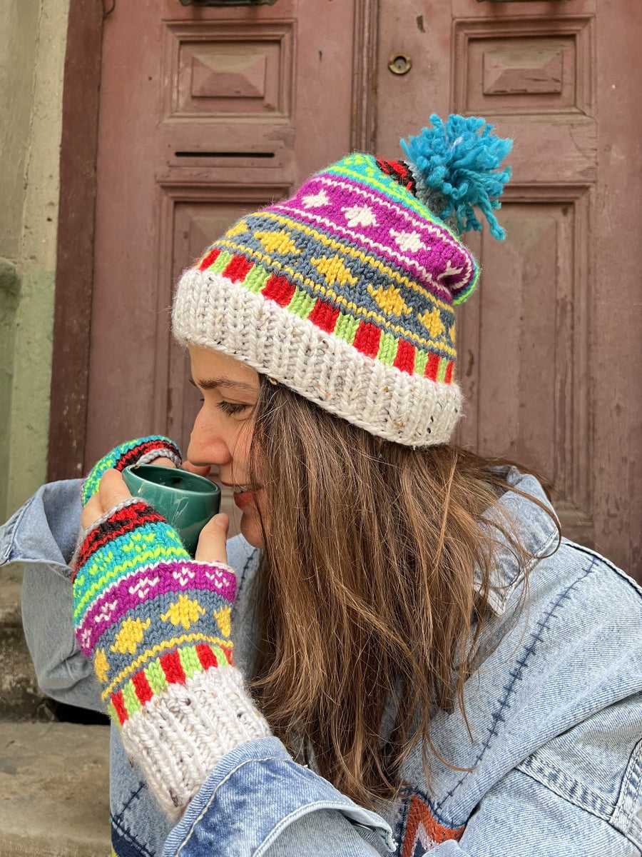 Bohem desenlerle süslenmiş bere ve parmak ucu açık eldivenler, soğuk günlerde konforlu bir kullanım sunar. Eldivenlerdeki açık parmak tasarımı, telefon kullanımı veya sıcak bir içeceğin tadını çıkarırken ellerinizi özgür bırakır. Renklerin dans ettiği bu setler, hem stilinizi tamamlayacak hem de kış aylarında size eşlik edecek benzersiz aksesuarlar olarak öne çıkıyor.