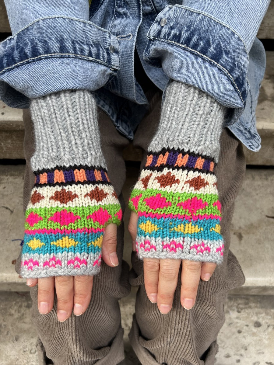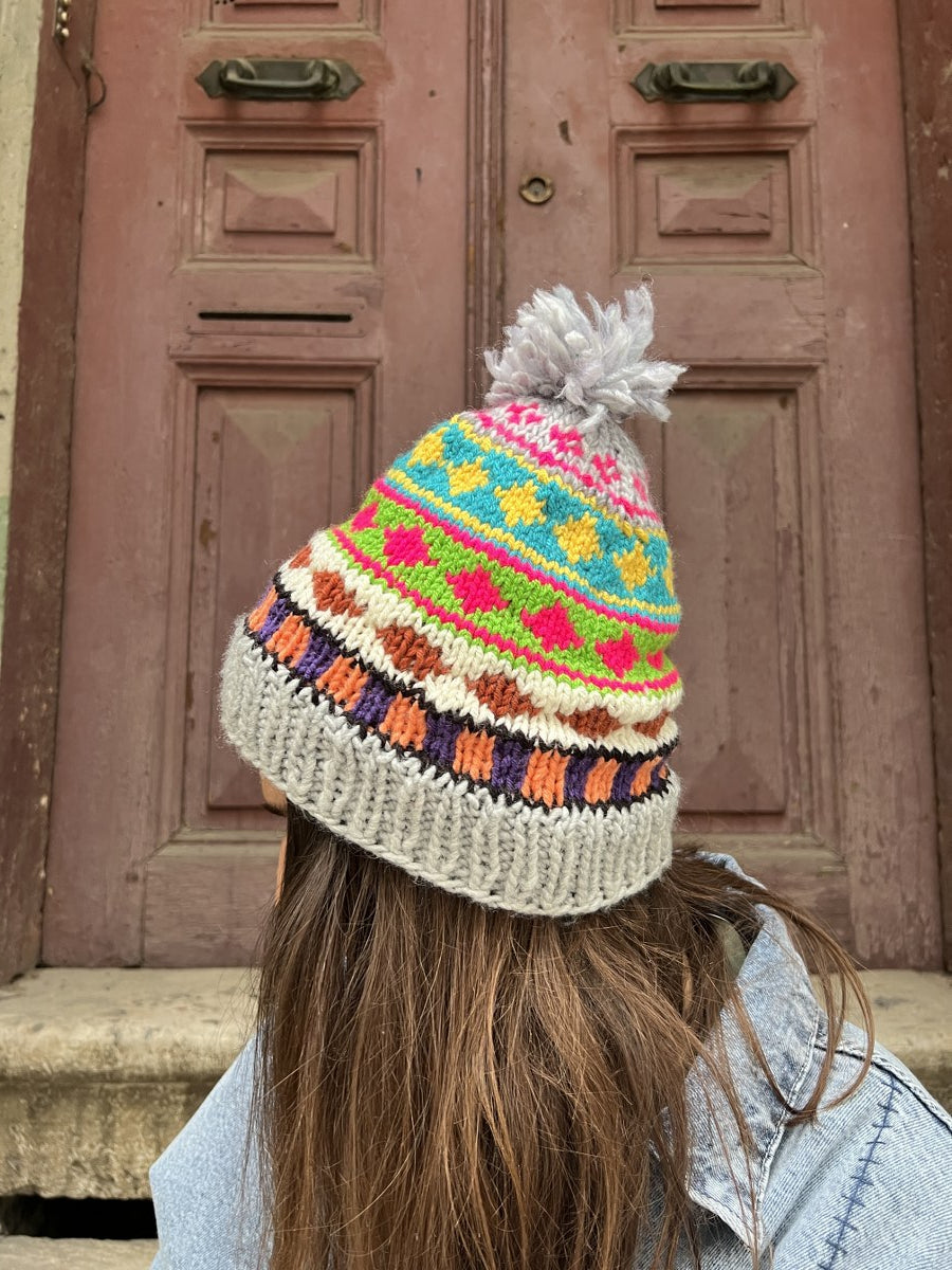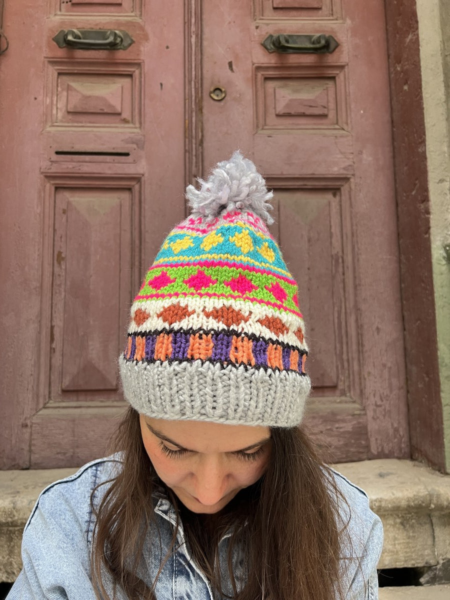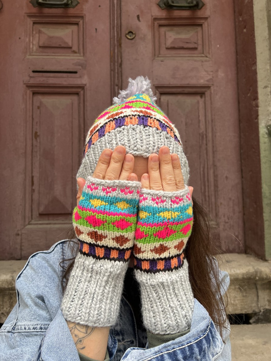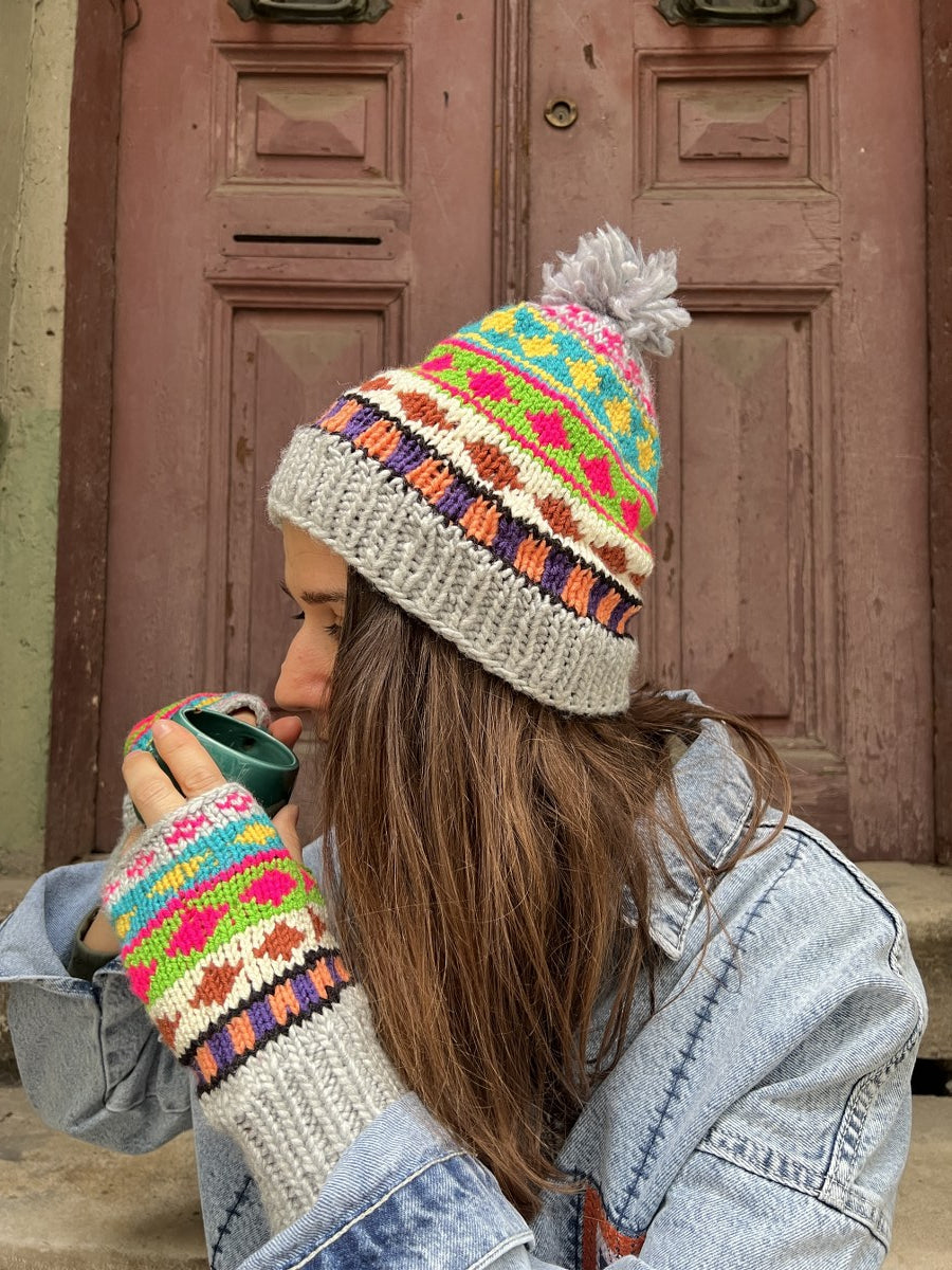 El Yapımı Renkli Bohem Bere Eldiven Takımı – Kışlık Örgü Desenli Kadın Bere- Gri