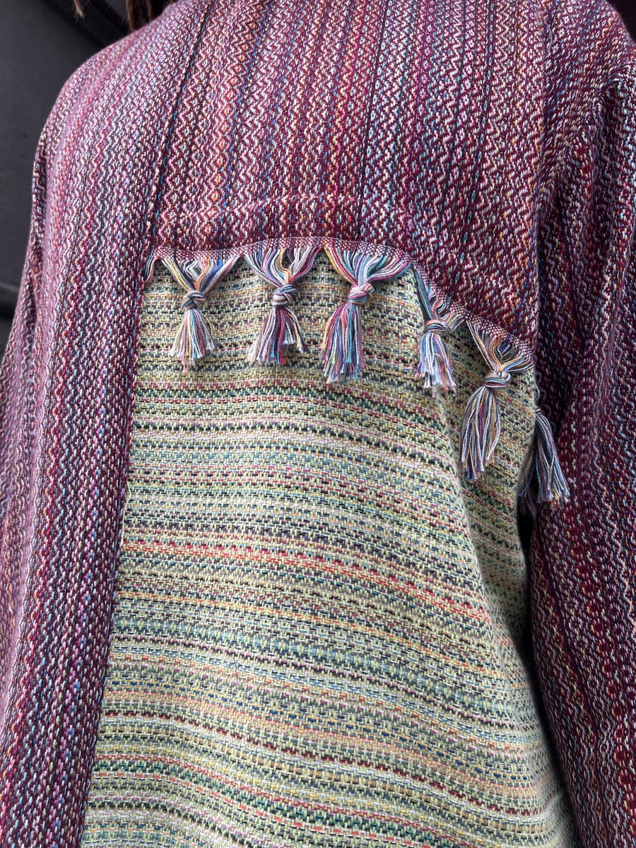 Göğüs kısmındaki etnik dokuma panel, ustaların el emeğiyle oluşturulan benzersiz bir detay sunar.