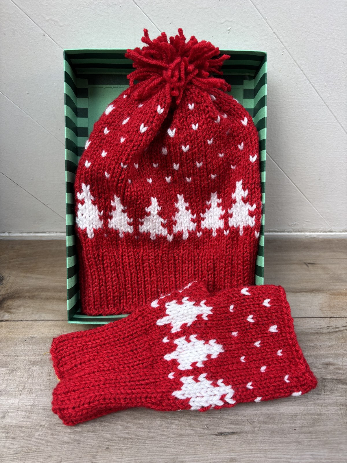Hediye Kutulu El Örgüsü Yılbaşı Bere Eldiven Takımı- Kırmızı