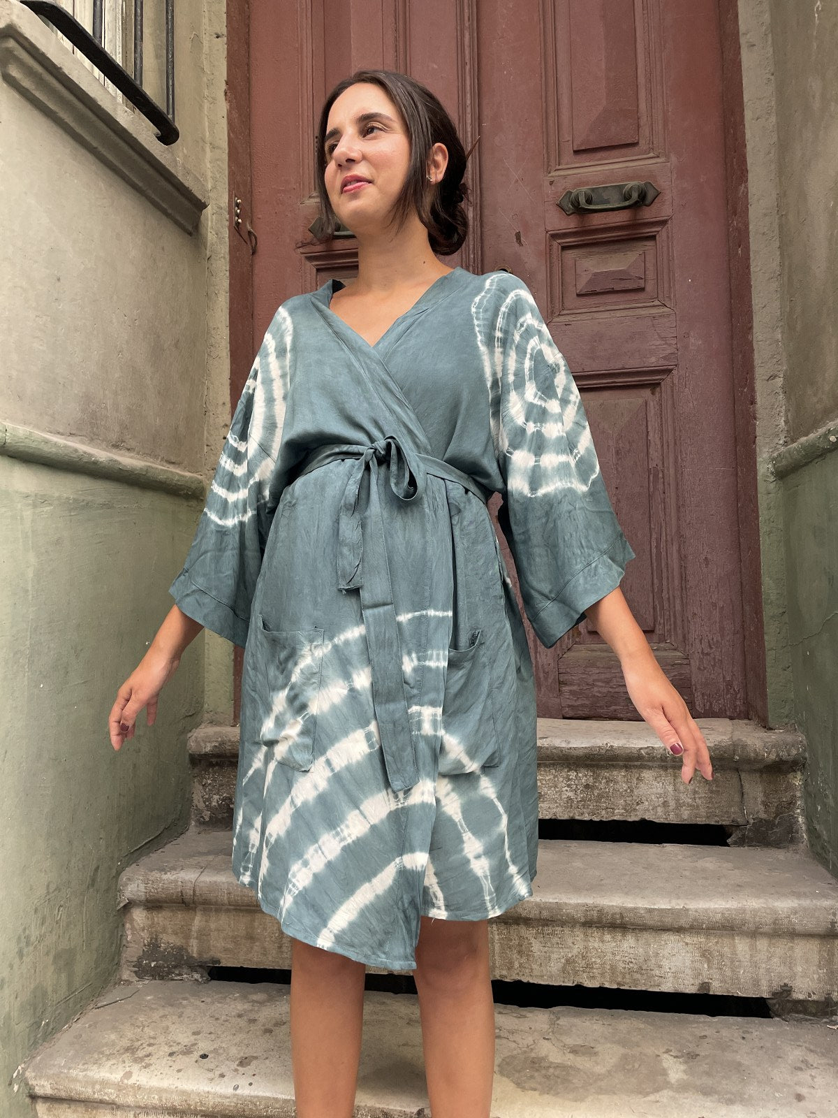Kadın emeğiyle hayata gelen bu özel kimono, doğal batik boyama tekniğiyle elde renklendirildi. Dinginliğin ve su elementinin ilhamıyla ortaya çıkan Aqua desen, içsel huzuru ve sadeliği yansıtıyor. Her bir desen, doğanın özgün akışını taşıyor. Her biri tek ve kendine özgüdür – çünkü tıpkı senin gibi tektir.