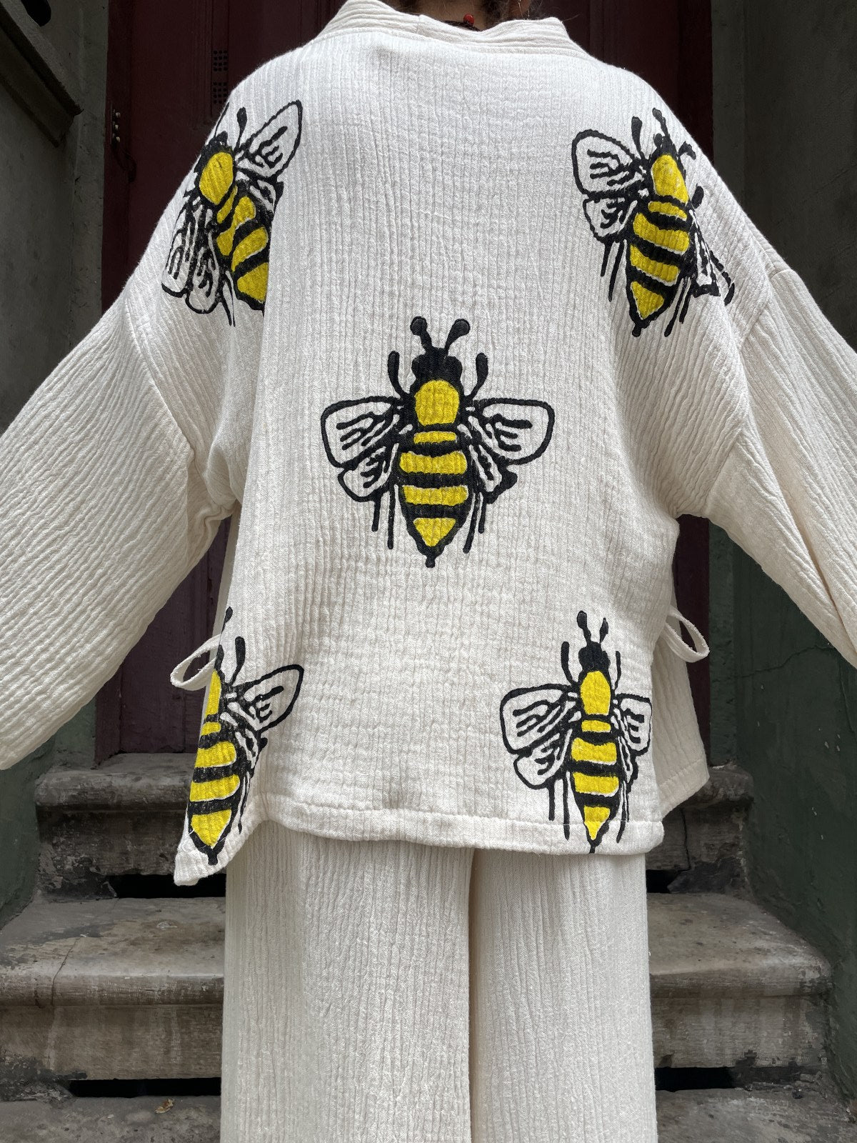 Arı Desenli Bohem Kadın Yoga Doğal Kumaş Kimono Takım Yoga Takımı