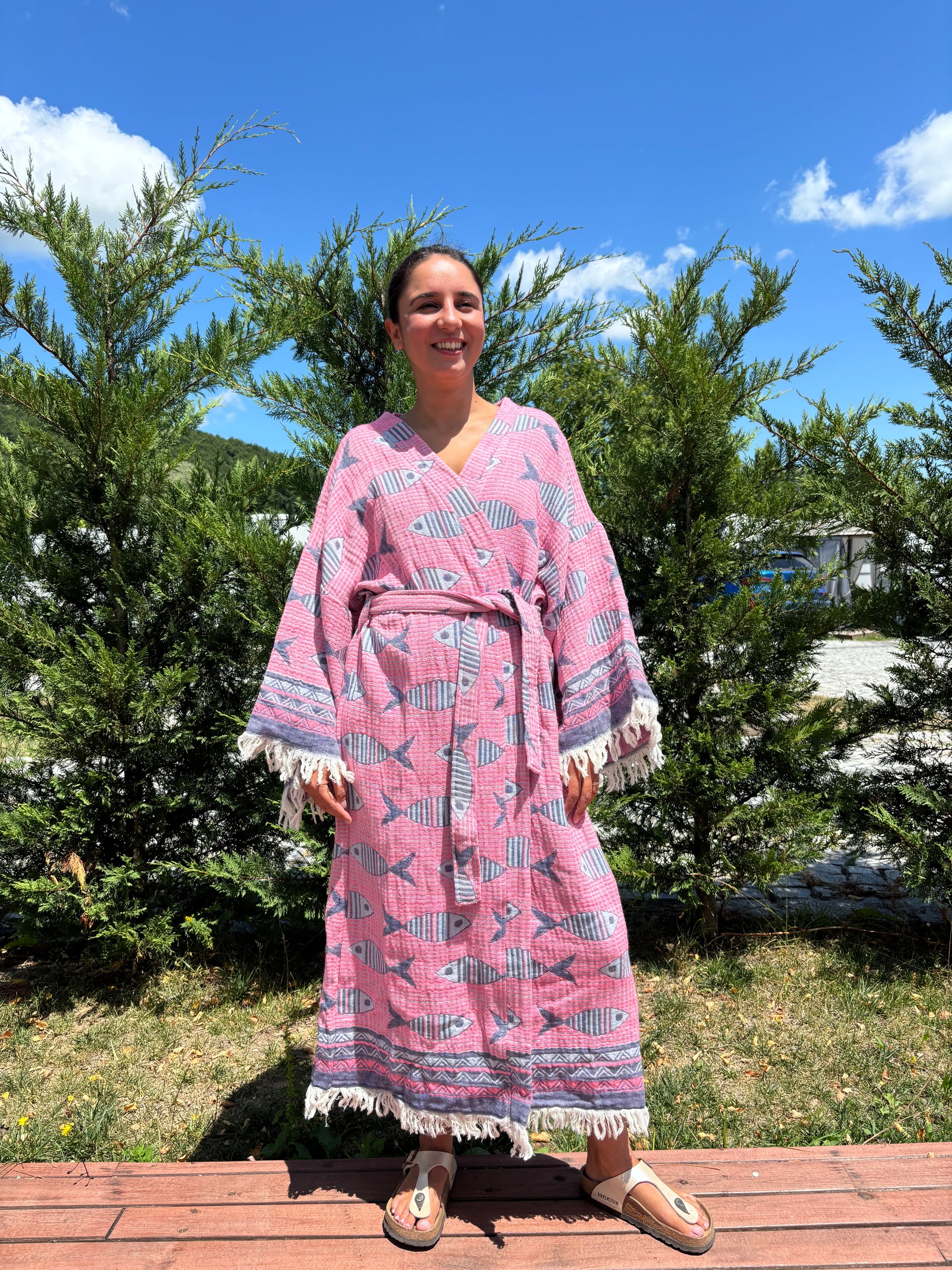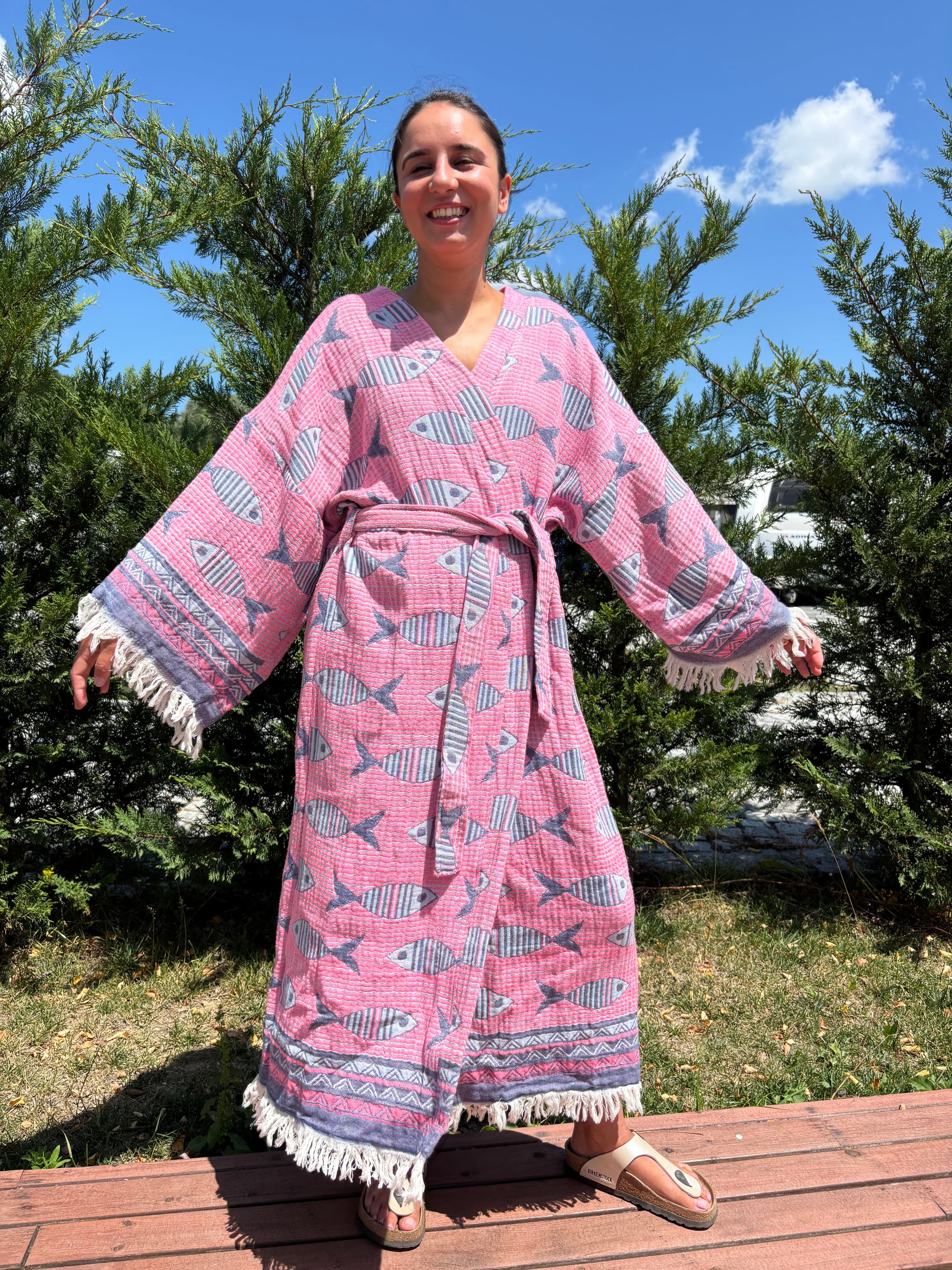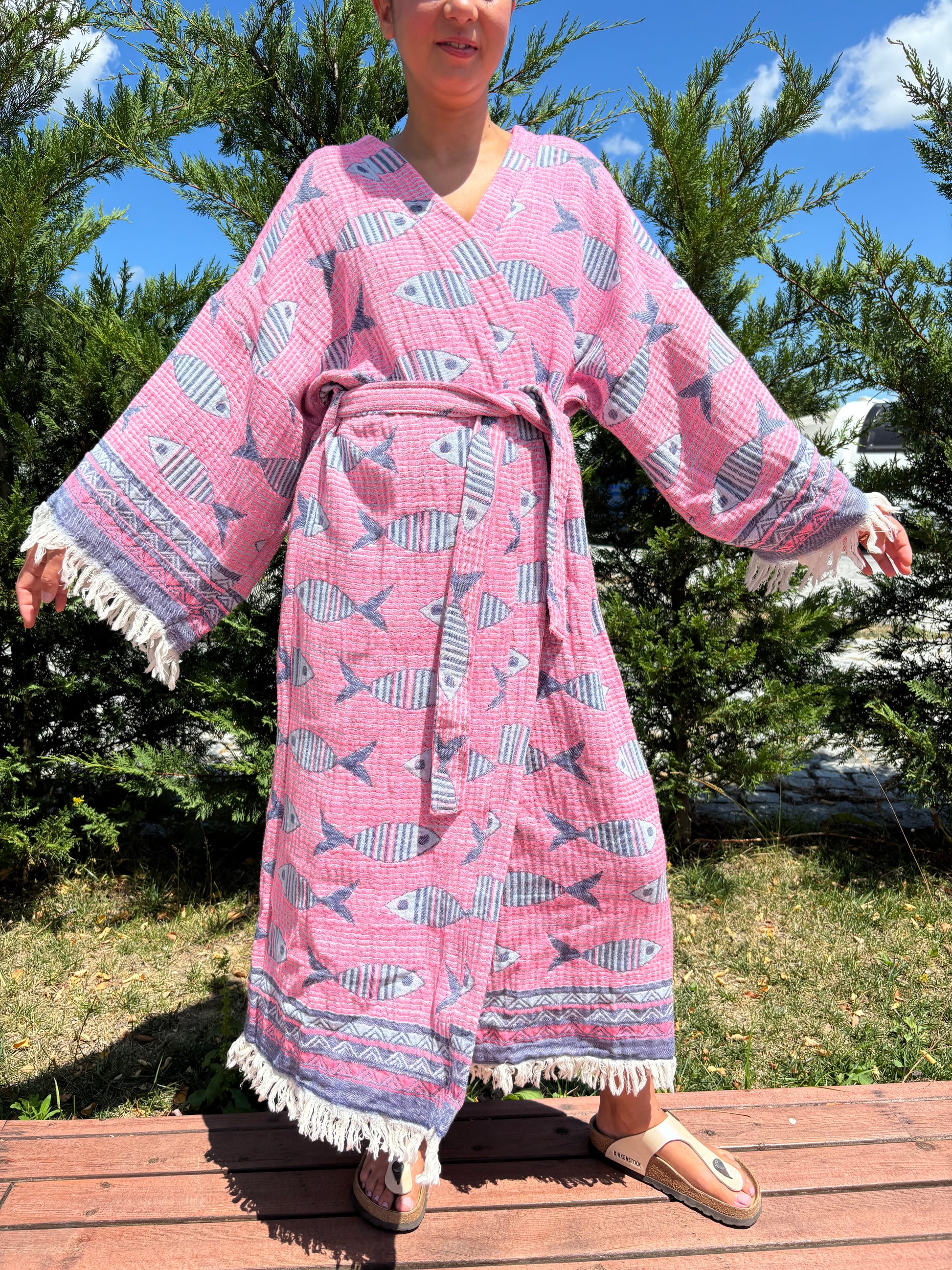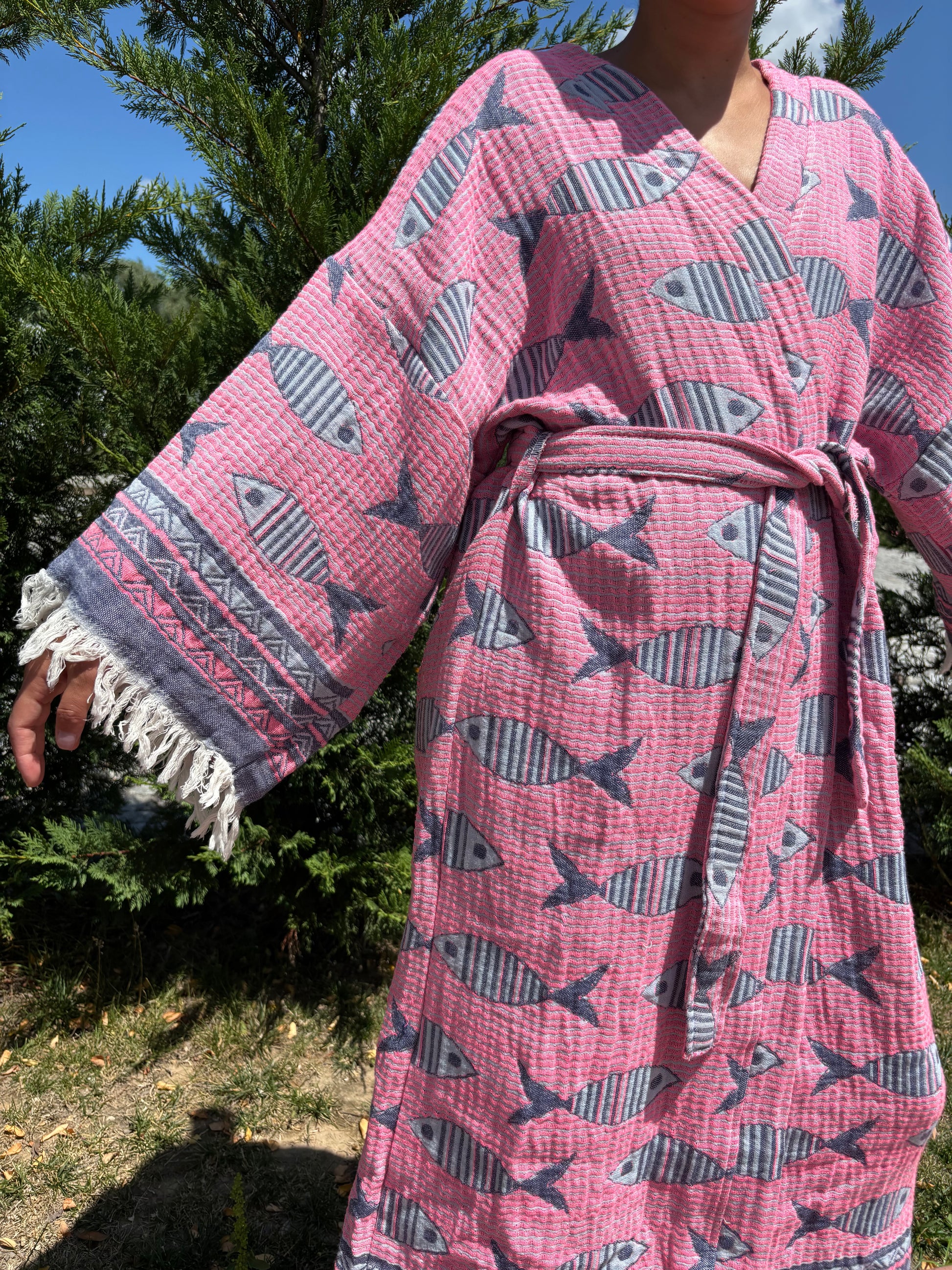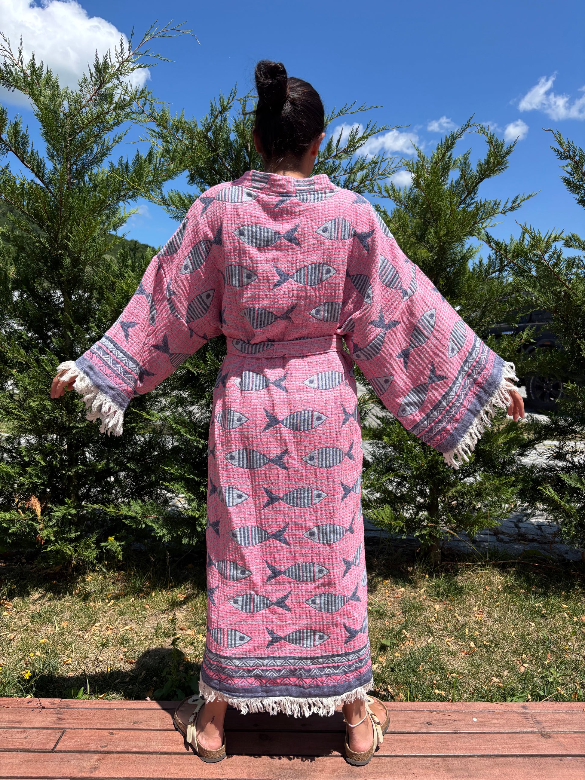 Balık Desenli Pamuk Kaftan Kimono– Kadın Bohem Stil – Pembe