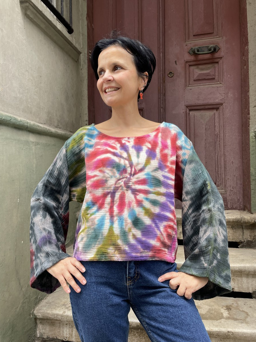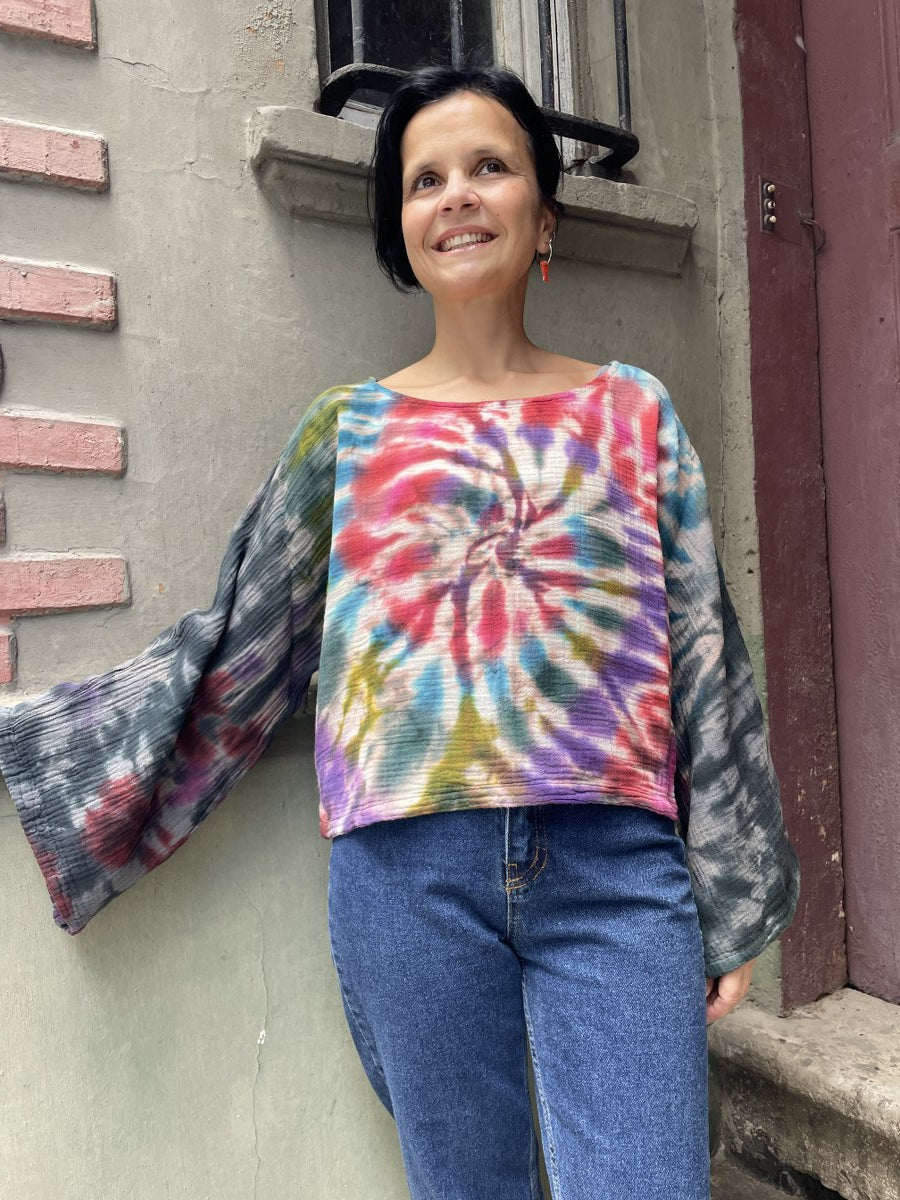 Batik Müslin Bluz – “Vortex” | El Boyaması, Renkli Spiral Desenli Bohem Tasarım