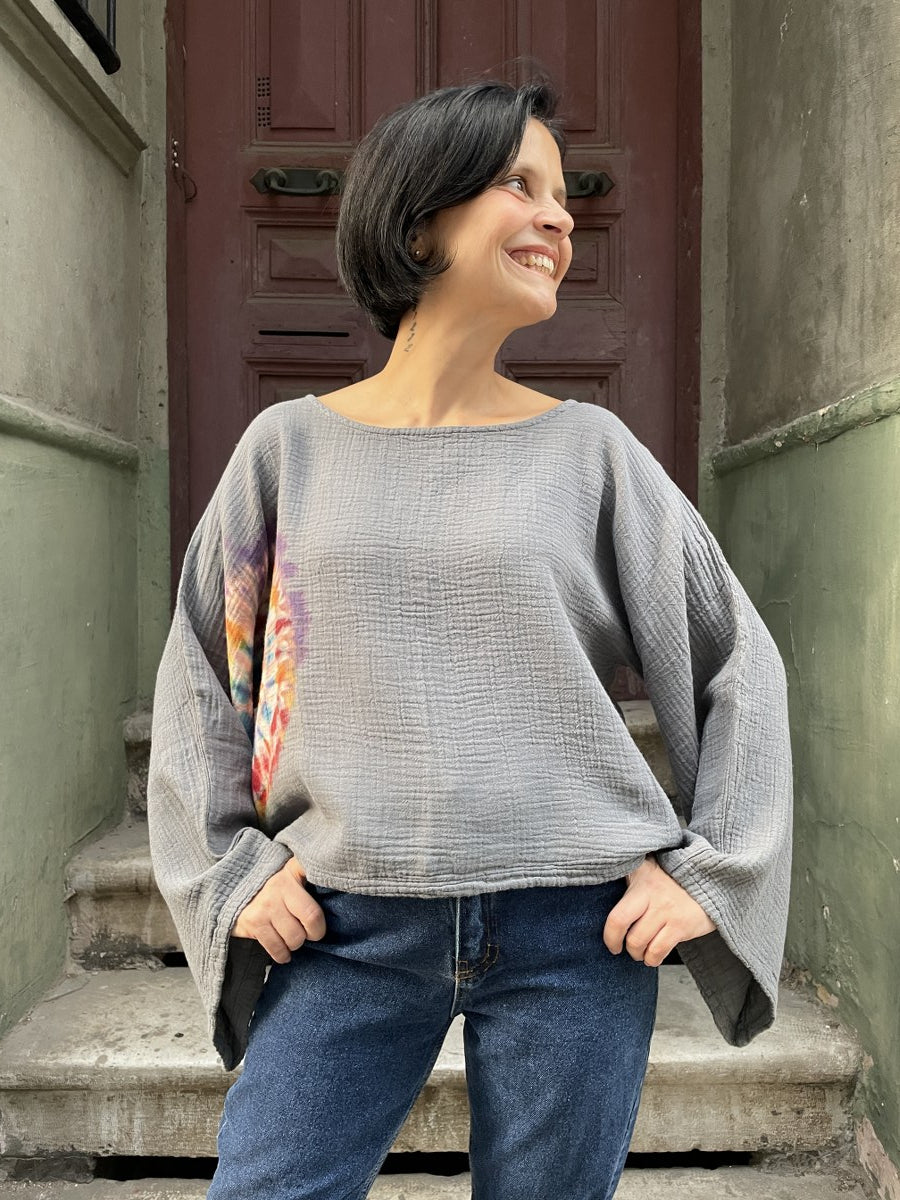 “Zenith”, gökyüzünün en yüksek noktasını, ruhun özgürleştiği o denge anını temsil eder. Gri müslin kumaş üzerine elde uygulanan renkli spiral batik deseniyle sakinlik ve enerjiyi bir arada taşır. El boyaması tekniğiyle üretilen bu özel bluz, her bir fırça darbesinde özgün bir hikâye anlatır. 🌤️