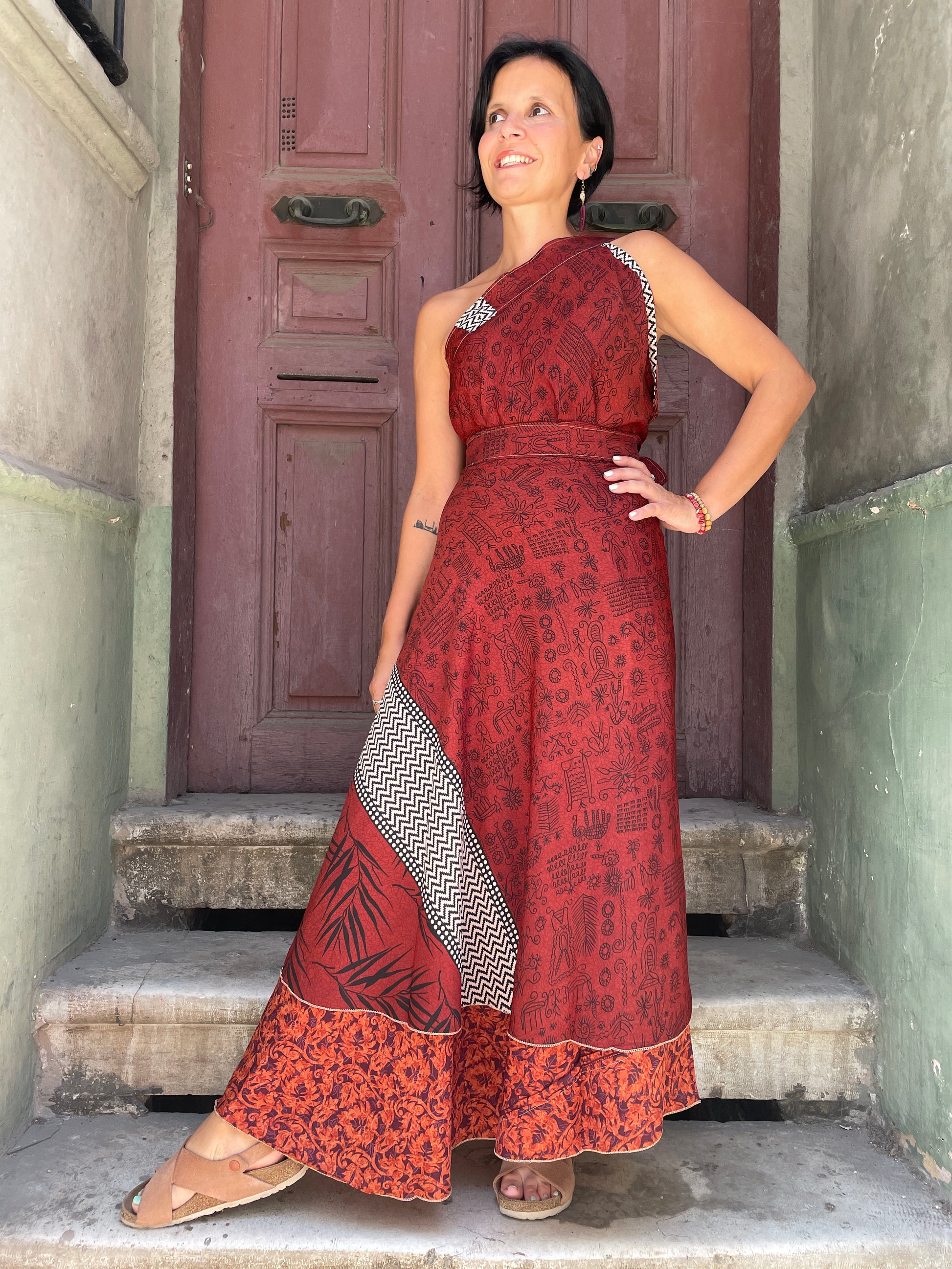 Geri dönüştürülmüş vintage sari kumaşlardan tasarlanmıştır