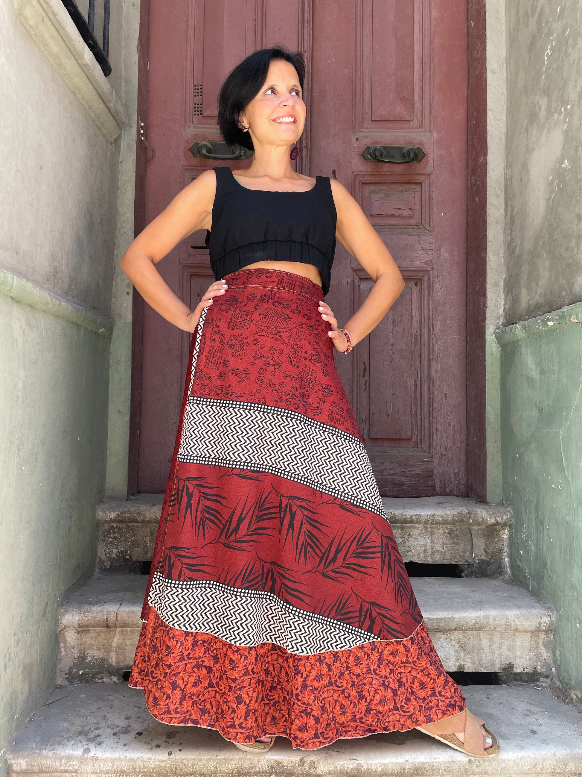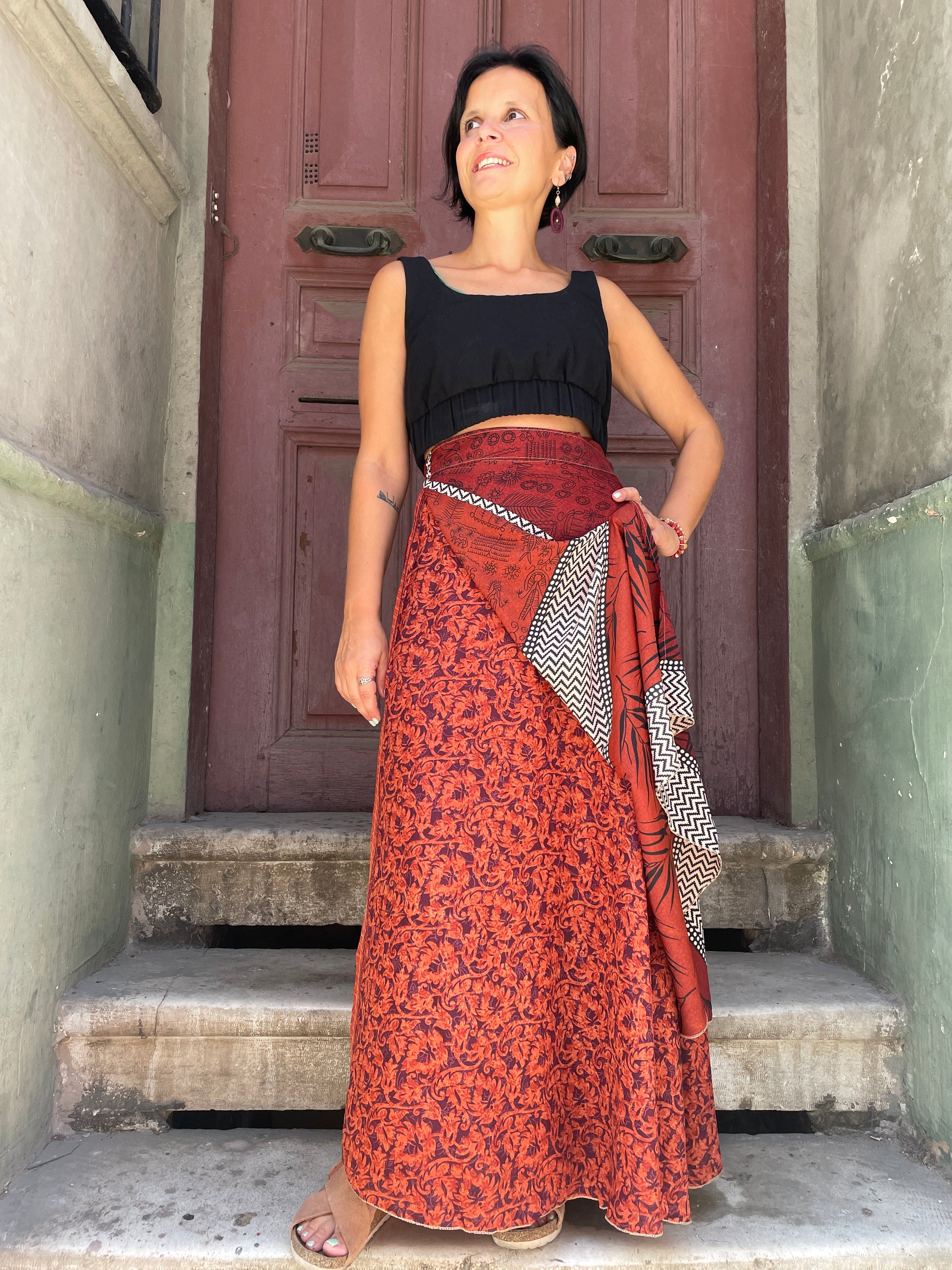 Doğanın enerjisi turuncusu renklere buluştu! Nepal’den gelen bu çift taraflı ipek etek, bir yüzünde zarif etnik desenlerle, diğer yüzünde ise canlı bir bohem stil sunar. Her biri el yapımı olan bu etekler sadece bir tane üretildi – çünkü senin kadar özel!