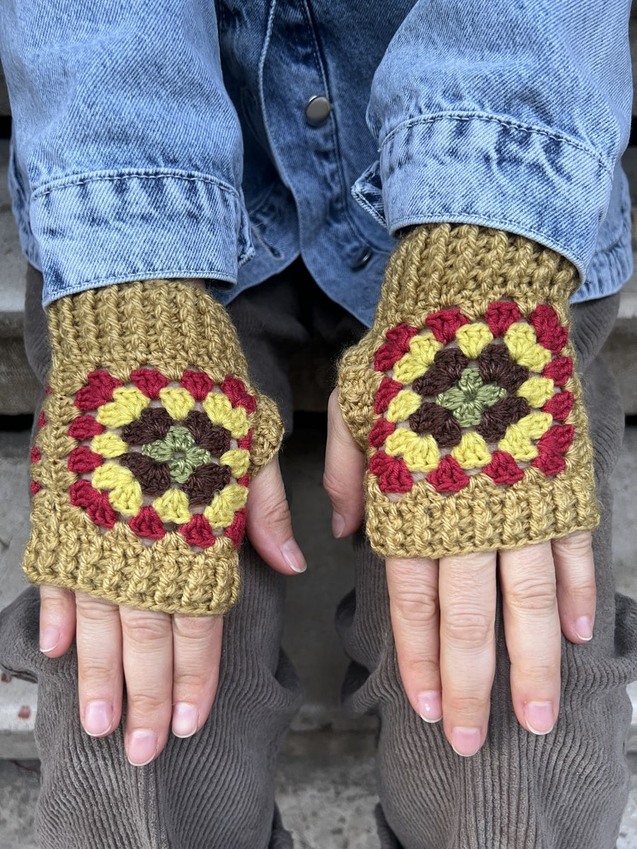 Bohem Motifli Parmaksız El Örgüsü Eldiven - Toprak