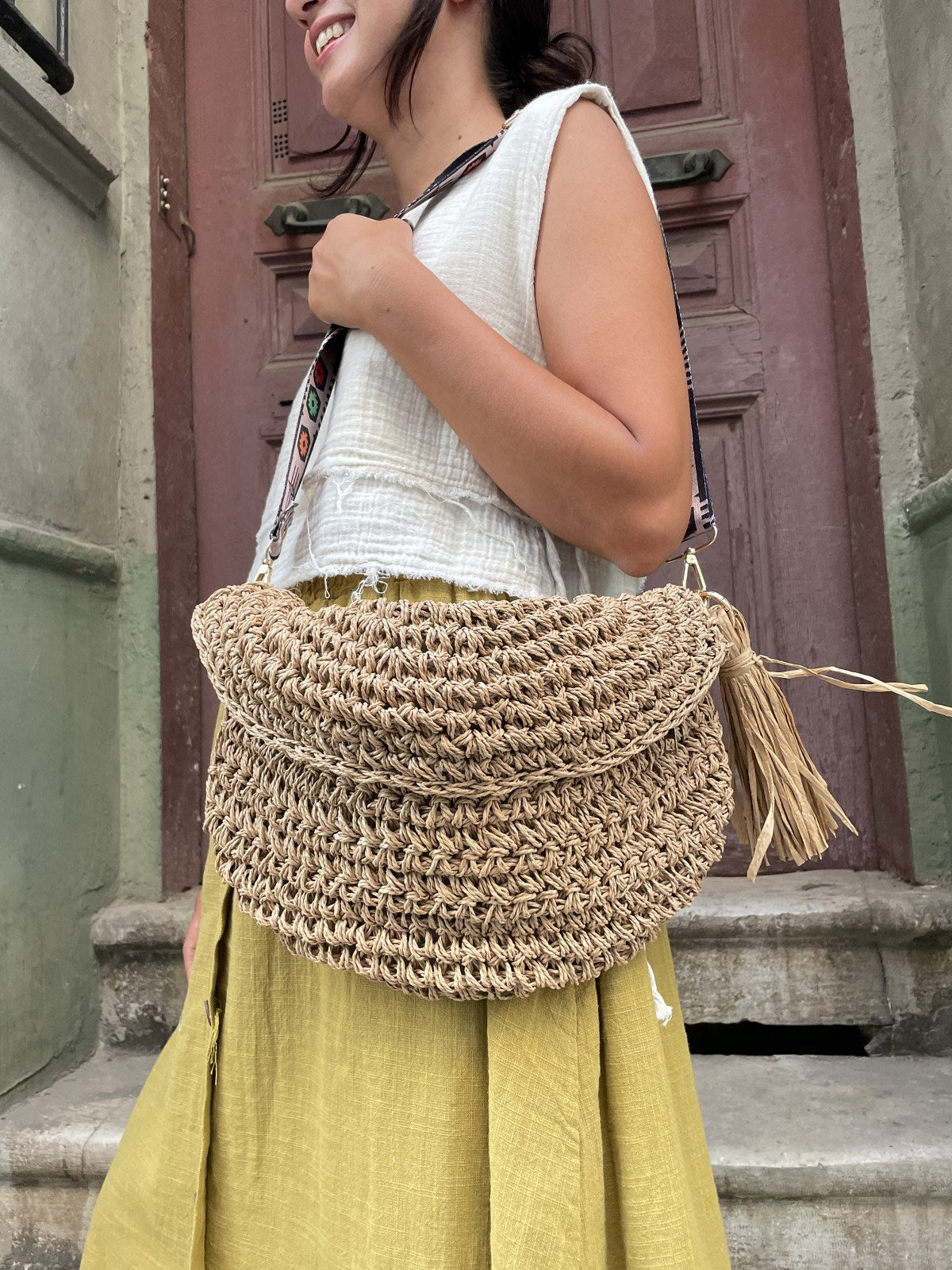 Doğallığın ve emeğin buluştuğu bu el yapımı çanta, dayanıklı kağıt ipten örülmüştür ve bohem tarzın en zarif tamamlayıcılarından biri olmaya aday. Kadın emeğiyle üretilen bu özel tasarım, fonksiyonelliği ve estetiği bir arada sunar.