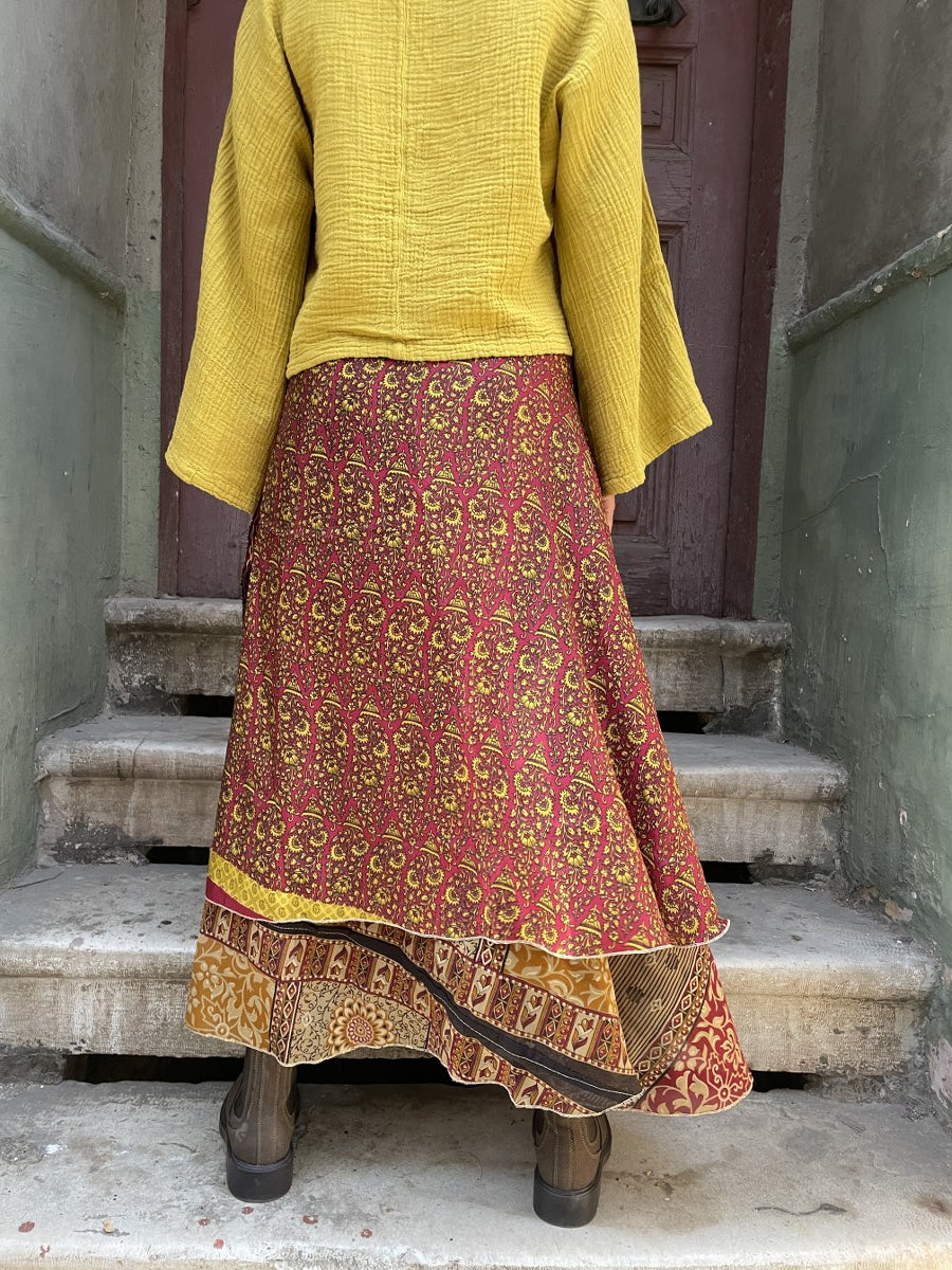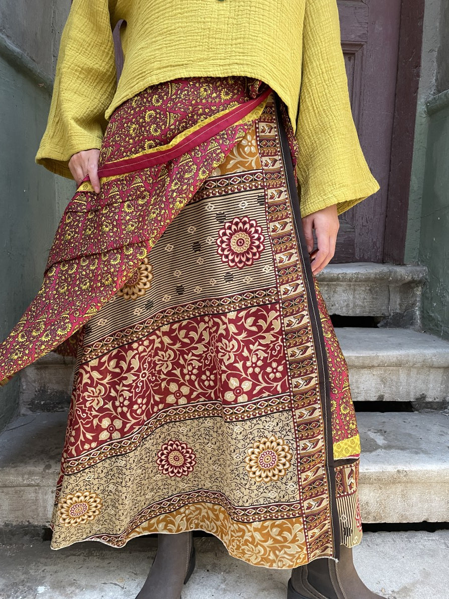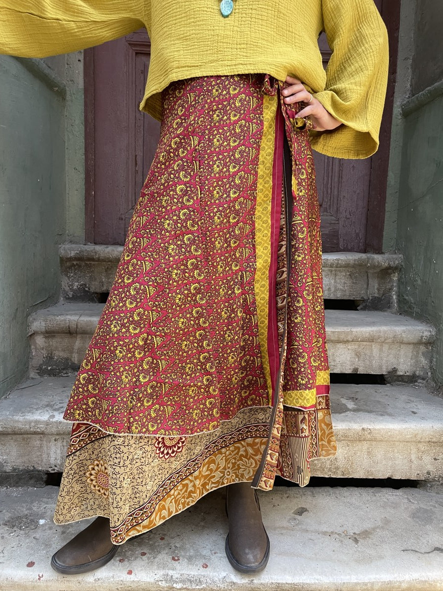 Nepal’de ustalar tarafından elde dikilen bu etek, tamamen ipek kumaştan üretilmiştir. Çift taraflı yapısıyla hem pratik hem de çevre dostu bir seçimdir; tek ürünle birden fazla stil yaratma imkânı sunar.