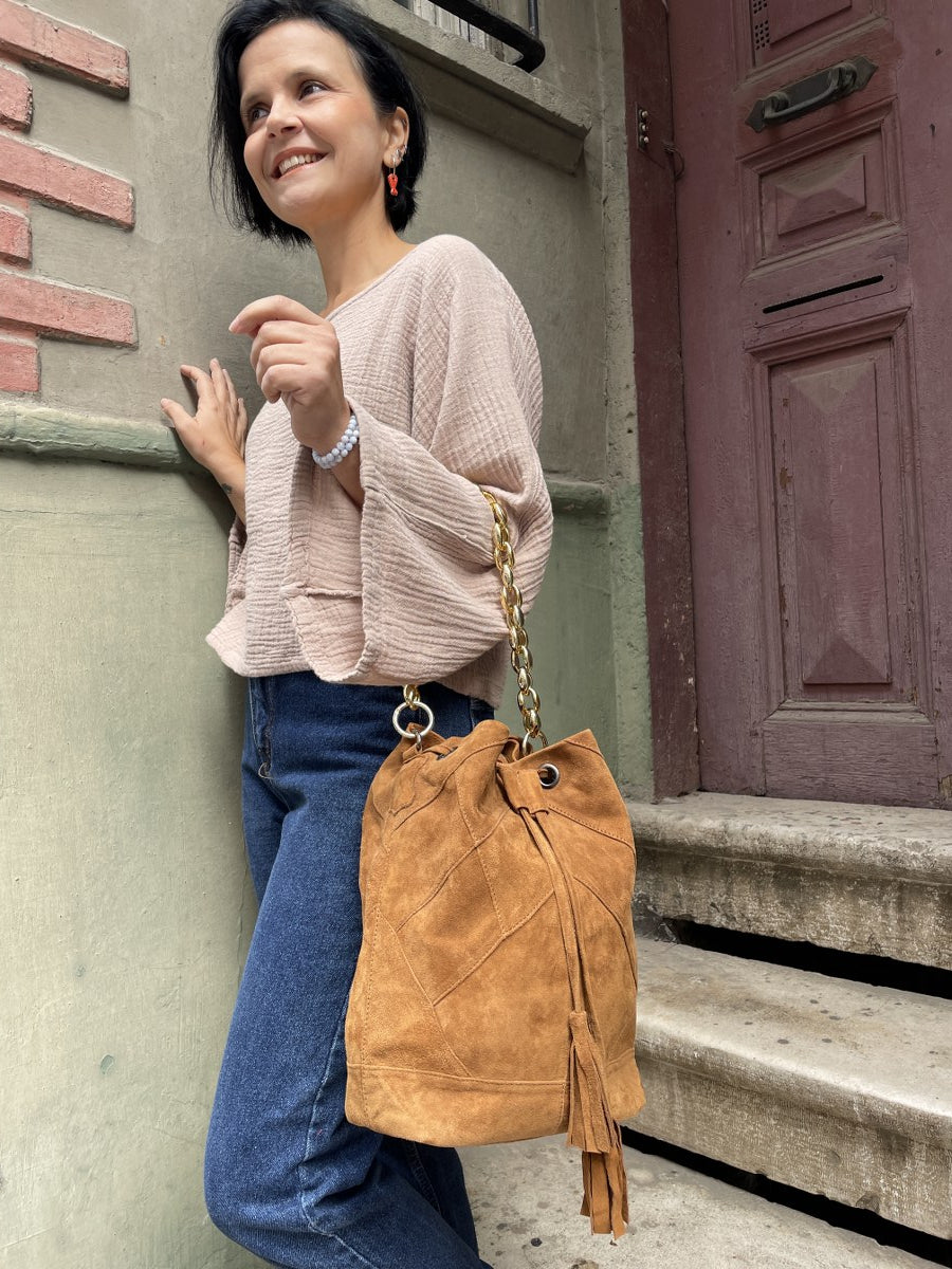 El işçiliğiyle üretilen bu süet deri zincirli çanta, bohem stilin zarafetini modern detaylarla buluşturur. Yumuşak dokulu süet kumaşı, altın zincir detayı ve ayarlanabilir askısıyla ister omuzda ister elde rahatlıkla kullanılabilir. Günlük şıklığı doğal bir dokuyla tamamlamak isteyenler için tasarlandı.