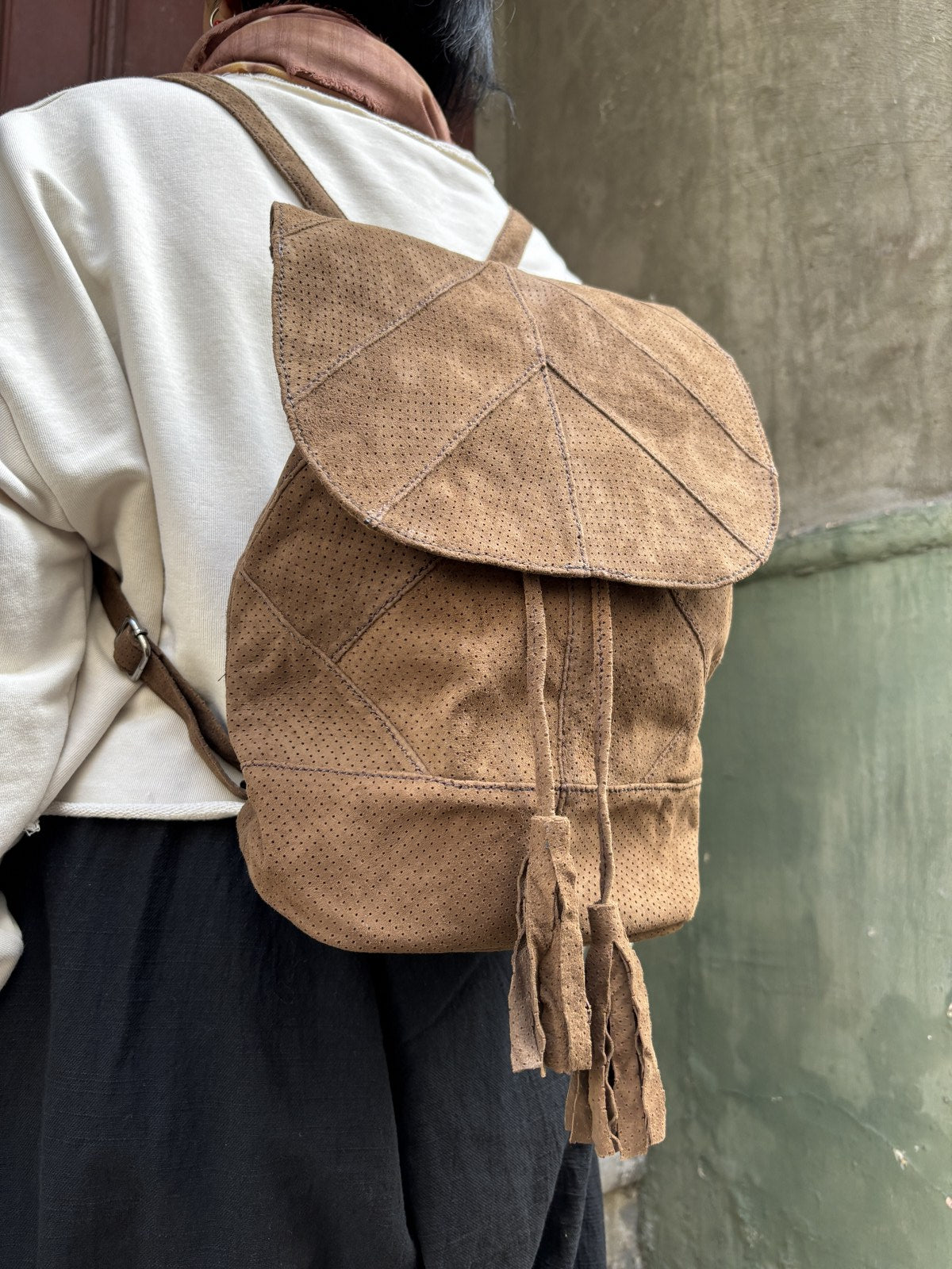 Gerçek Süet Deri Küçük Sırt Çantası – Bohem ve Şık Tasarım - Kahve