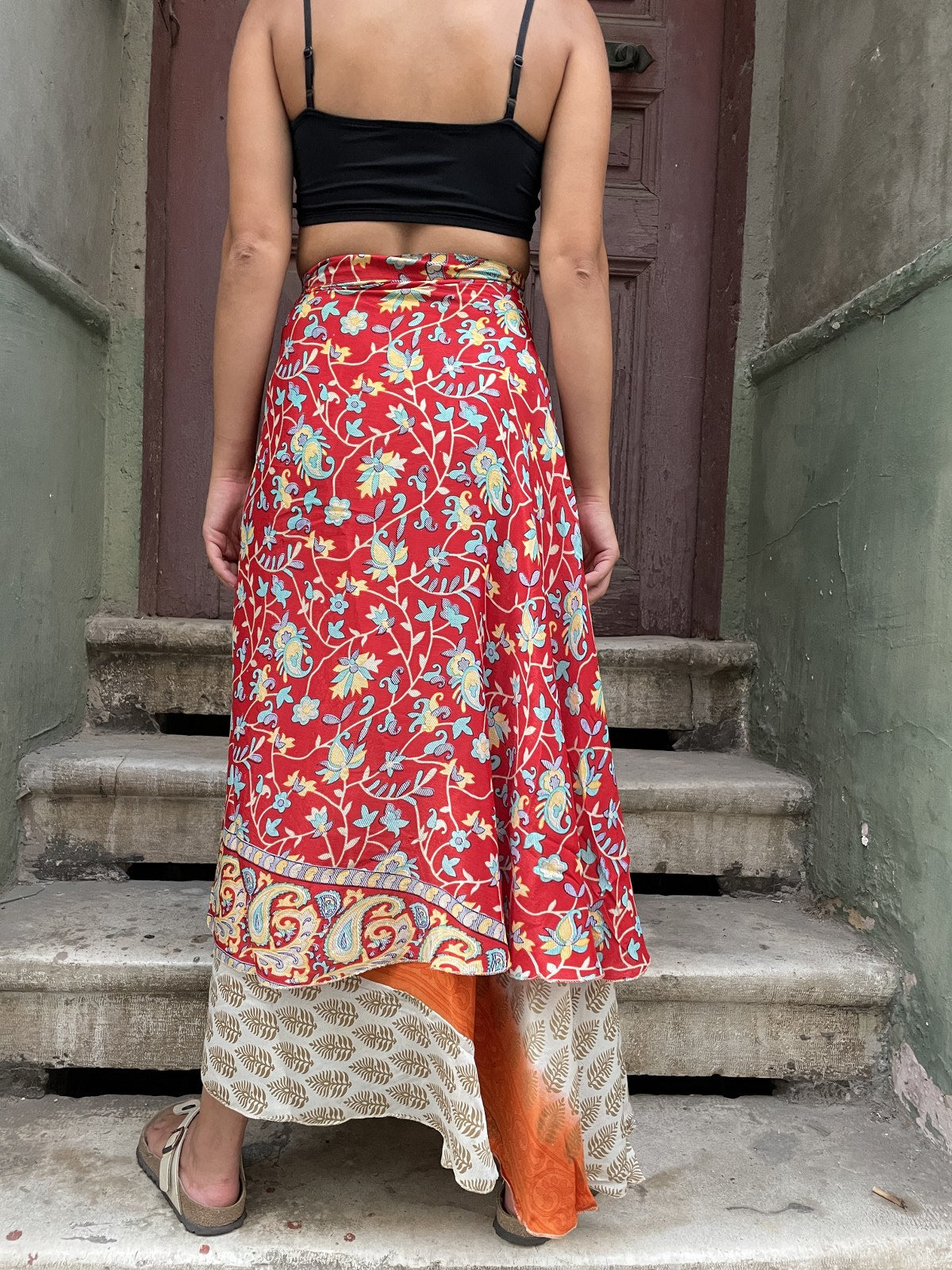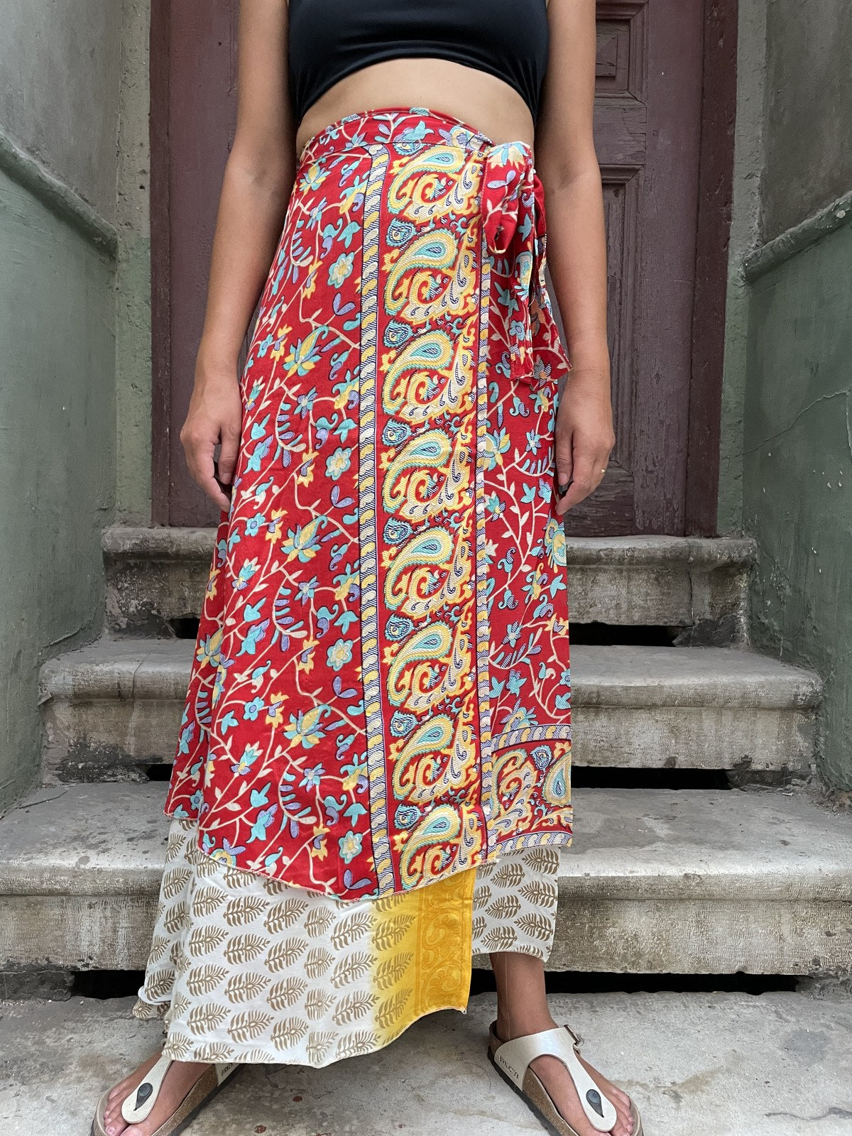 Canlı renklerin ve kültürel desenlerin buluştuğu bu çift taraflı ipek etek, Nepal’in el işçiliğiyle hayat buldu. Bir yüzünde kırmızı zemin üzerine sarı-mavi çiçekli ve paisley desenler, diğer yüzünde ise daha sade tonlar yer alıyor. İki yönlü kullanım özelliğiyle aynı eteği farklı kombinlerde yeniden keşfedin.