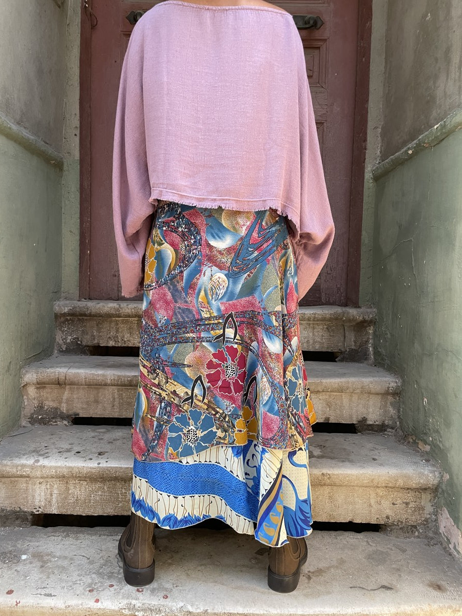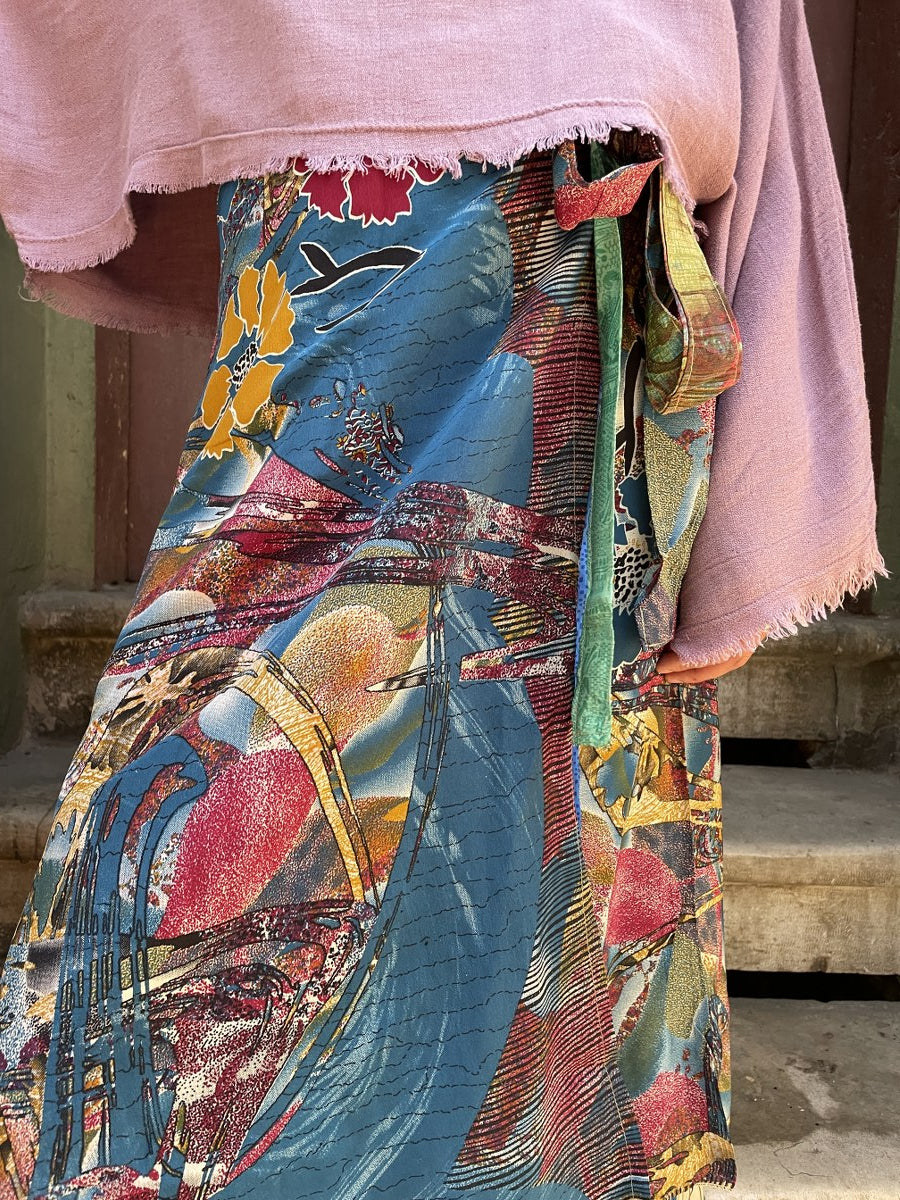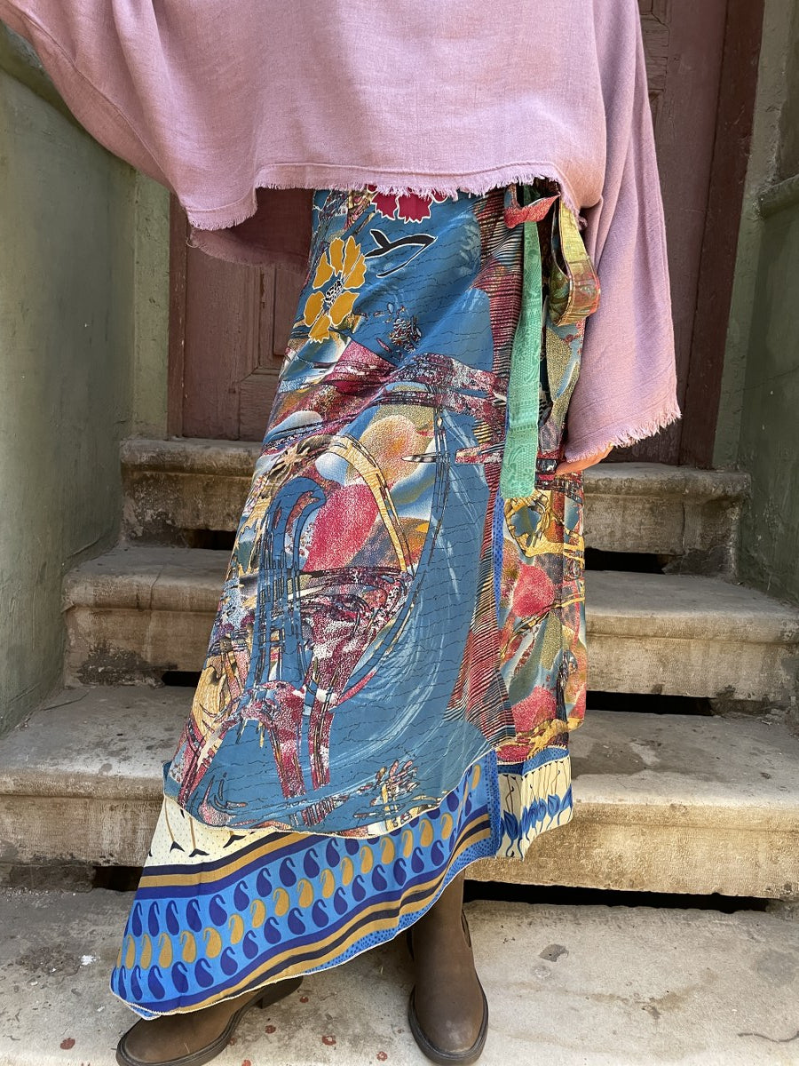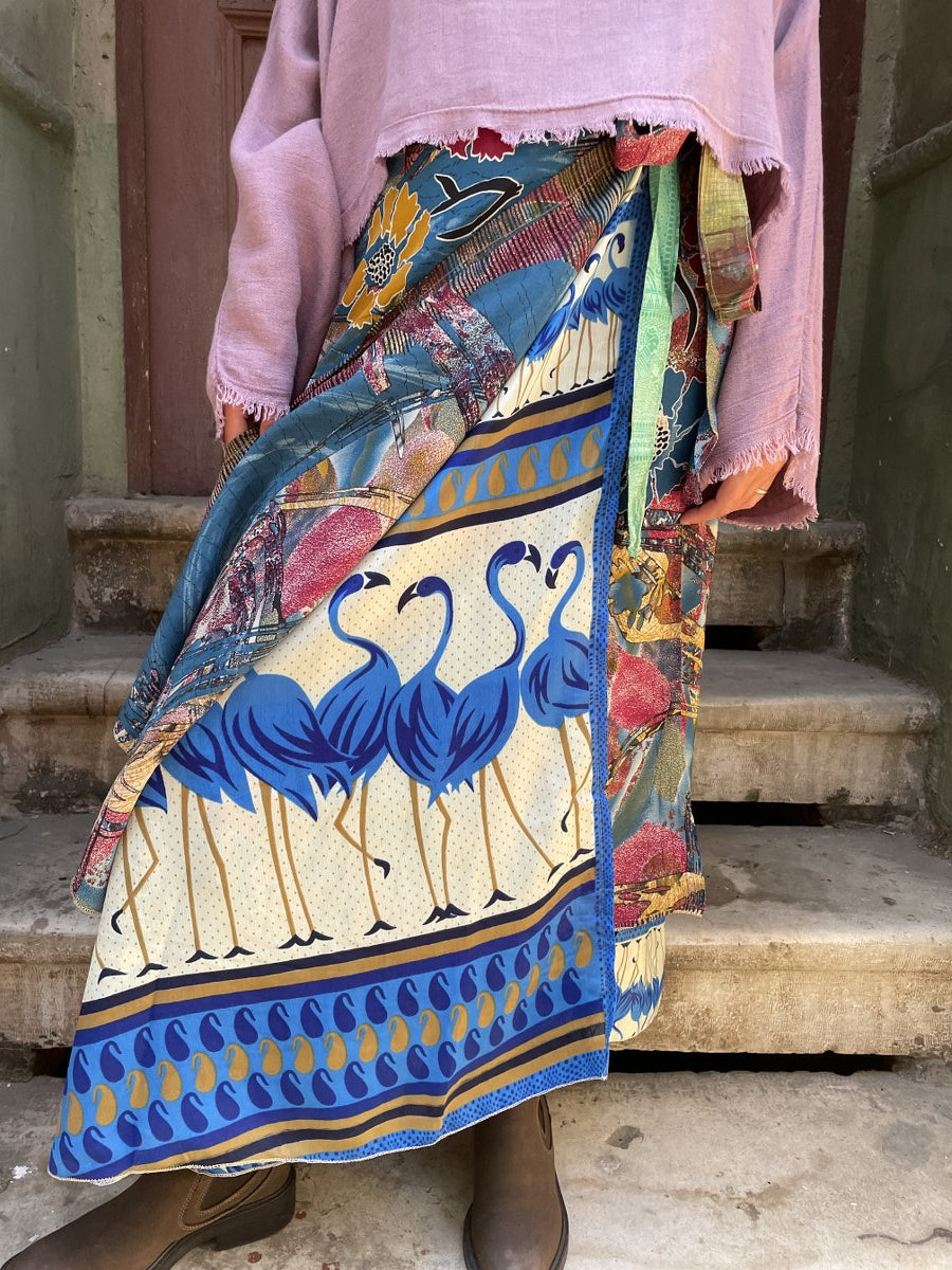 Nepal’de ustalar tarafından el işçiliğiyle üretilen bu etek, ipek kumaşın doğal zarafetini taşır. Her iki yüzeydeki farklı desenler sayesinde tek bir etekle çok yönlü kullanım olanağı sunar.