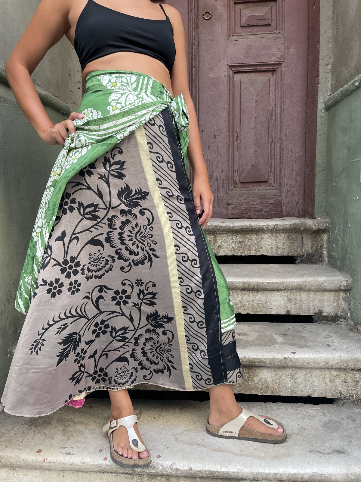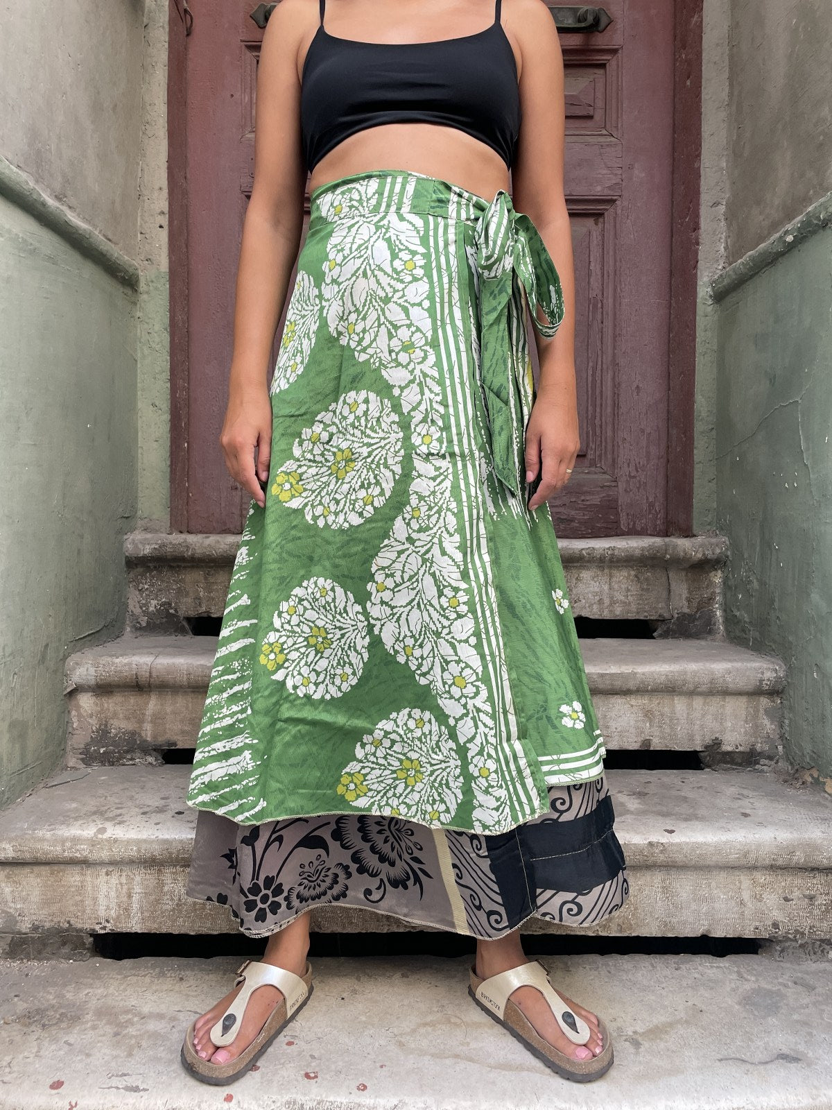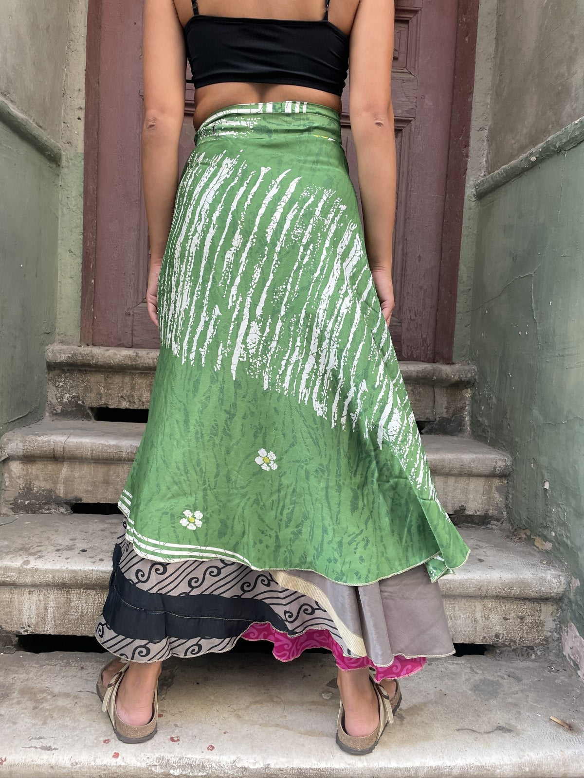 Nepal İpek Çift Taraflı Bağlamalı Etek – Siyah Yeşil Desenli