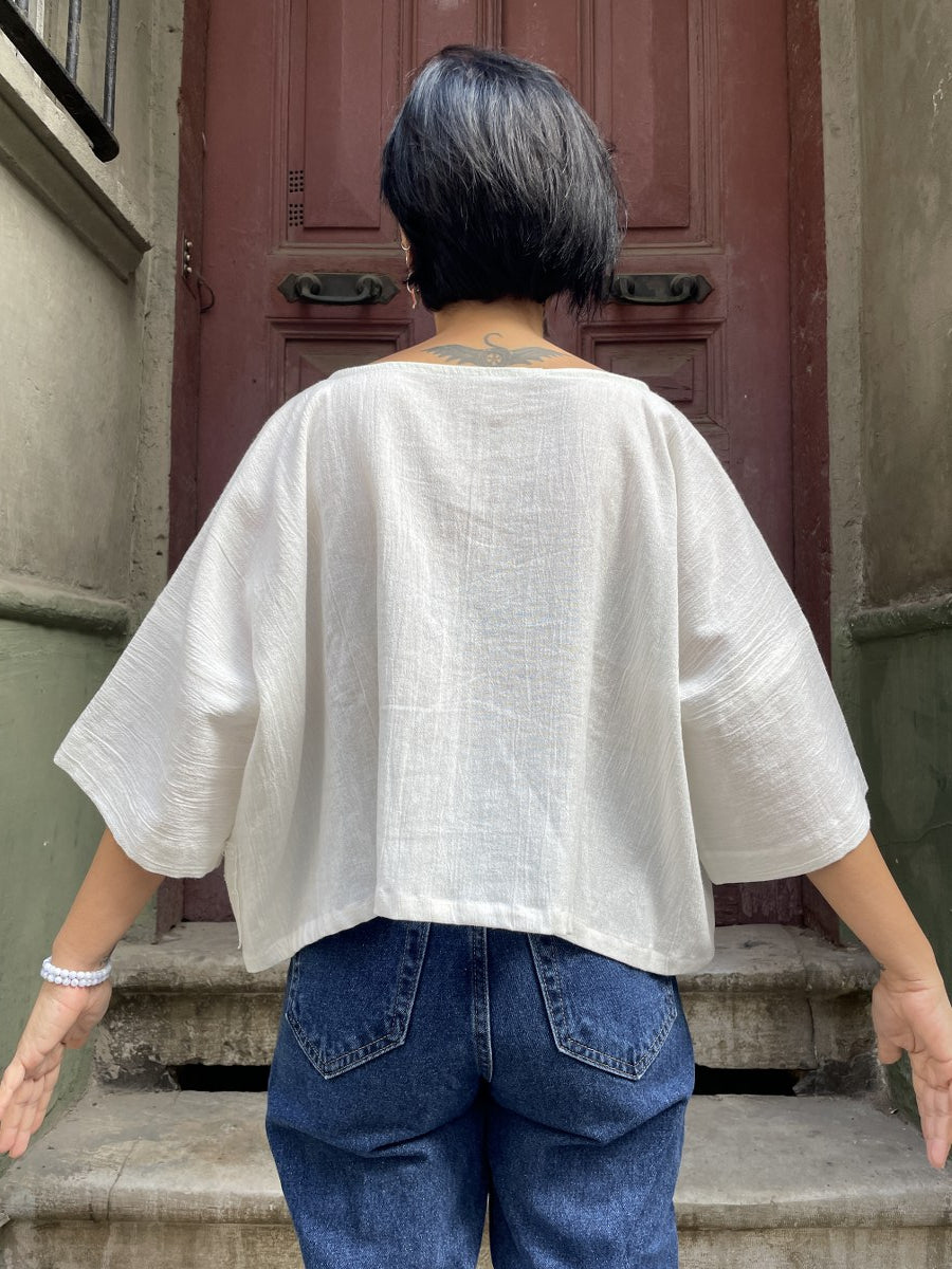 Her ürün tek ve benzersizdir, çünkü bu tasarımda sürdürülebilir üretim prensibiyle artan kumaş parçaları değerlendirildi. Etnik, bohem ve sanat esintileriyle özgün bir stil sunan bu bluz, rahat kesimi sayesinde gün boyu konfor sağlar.