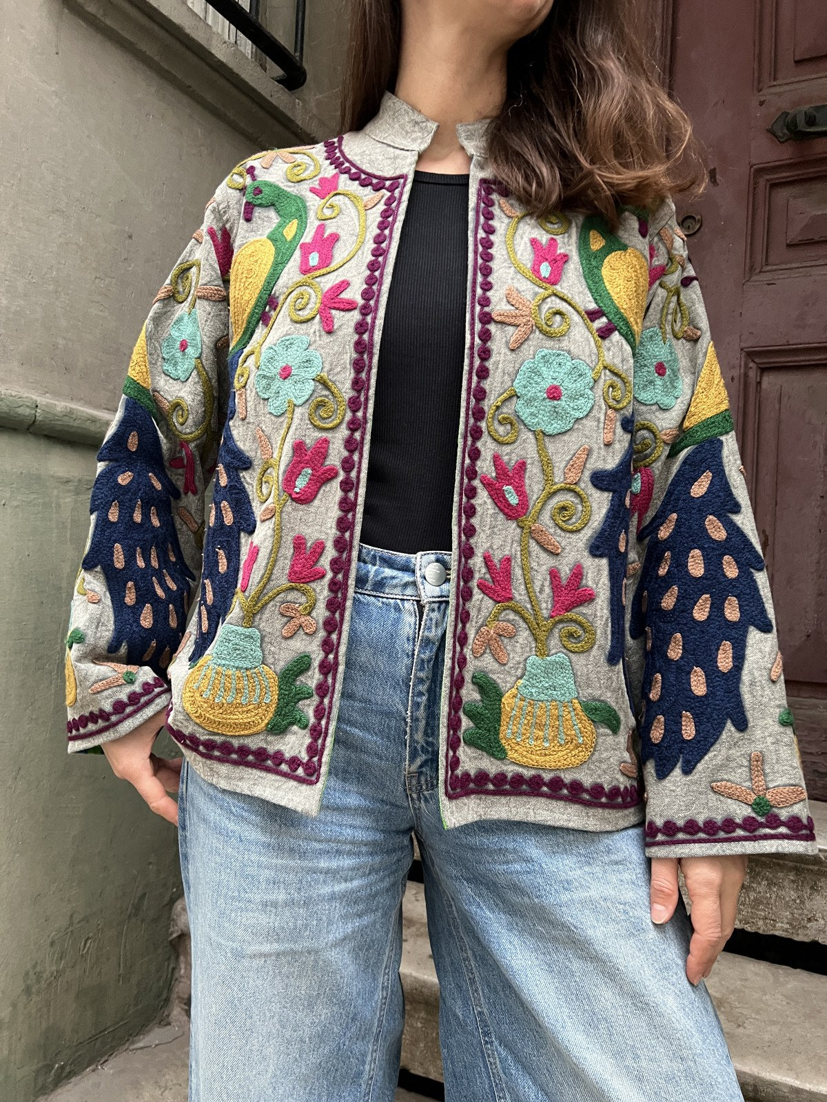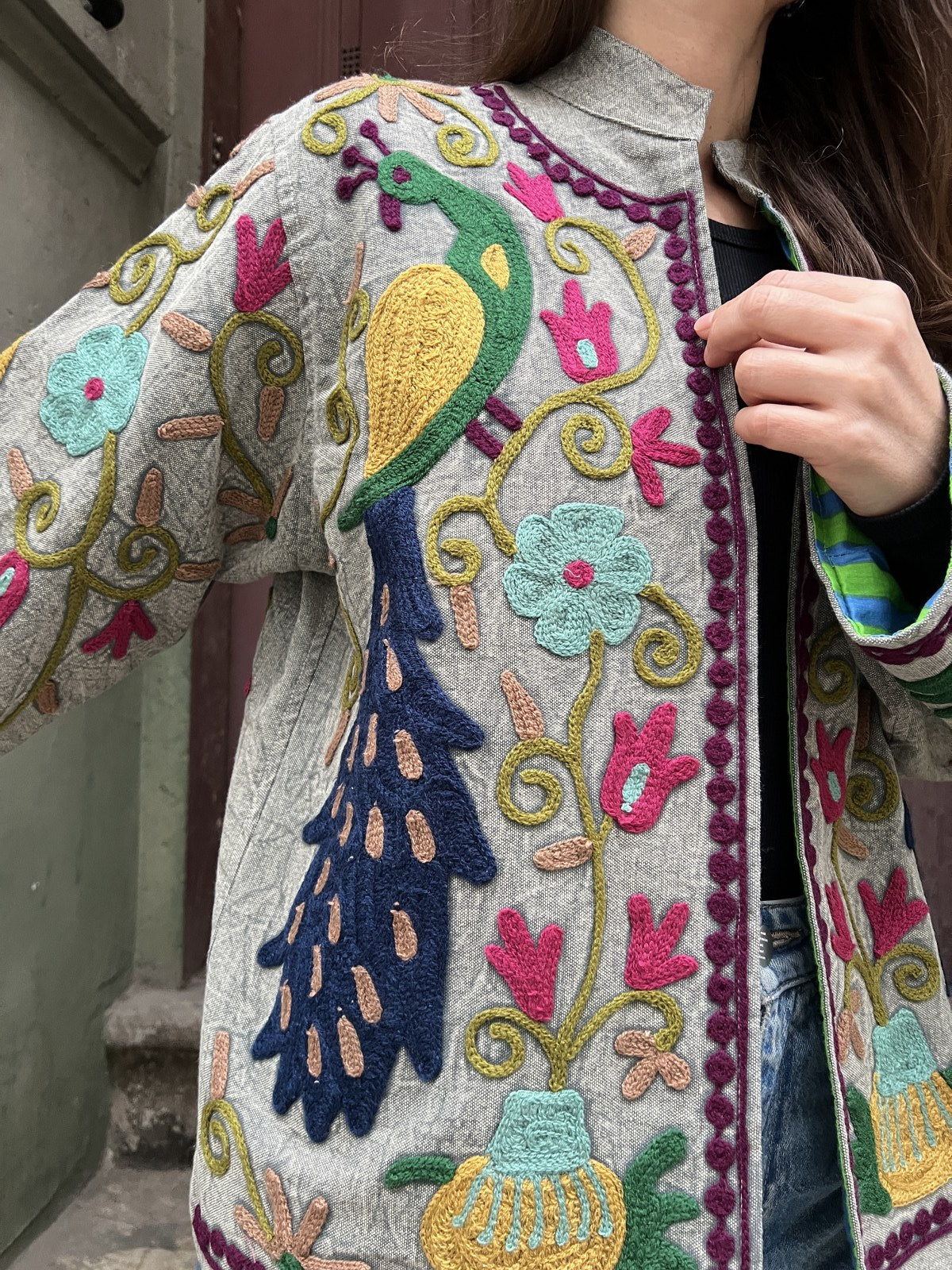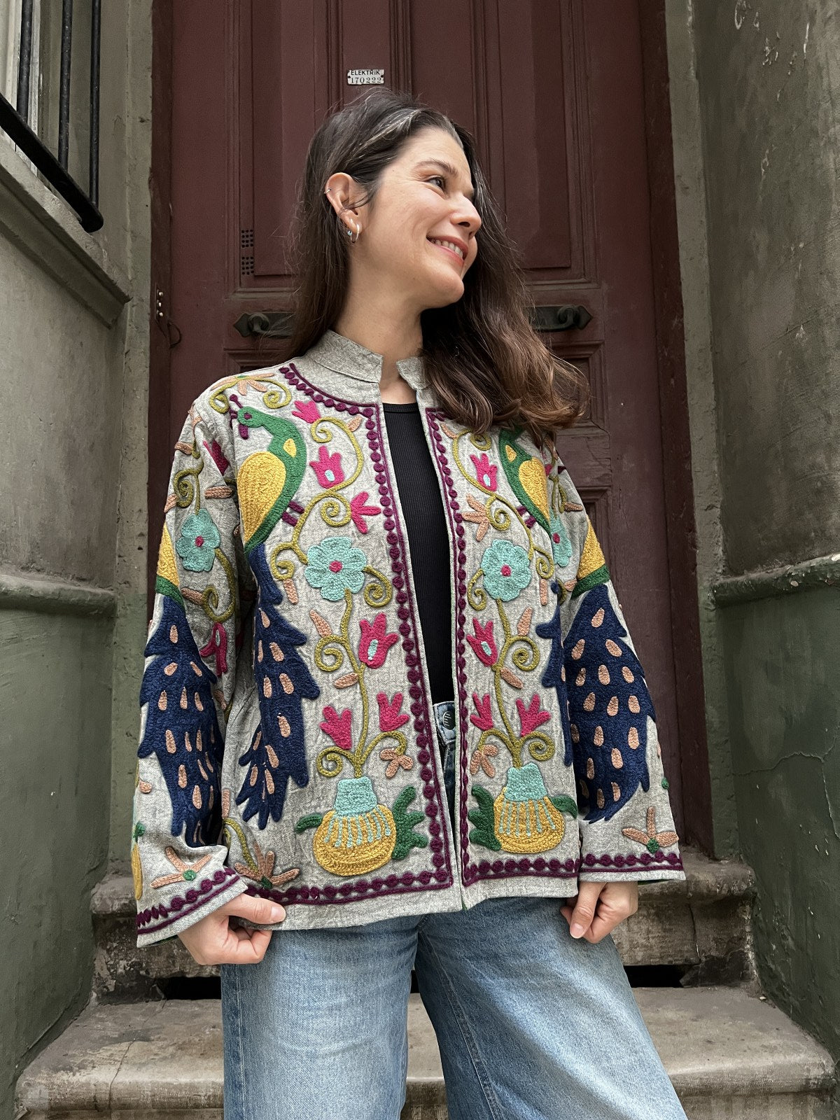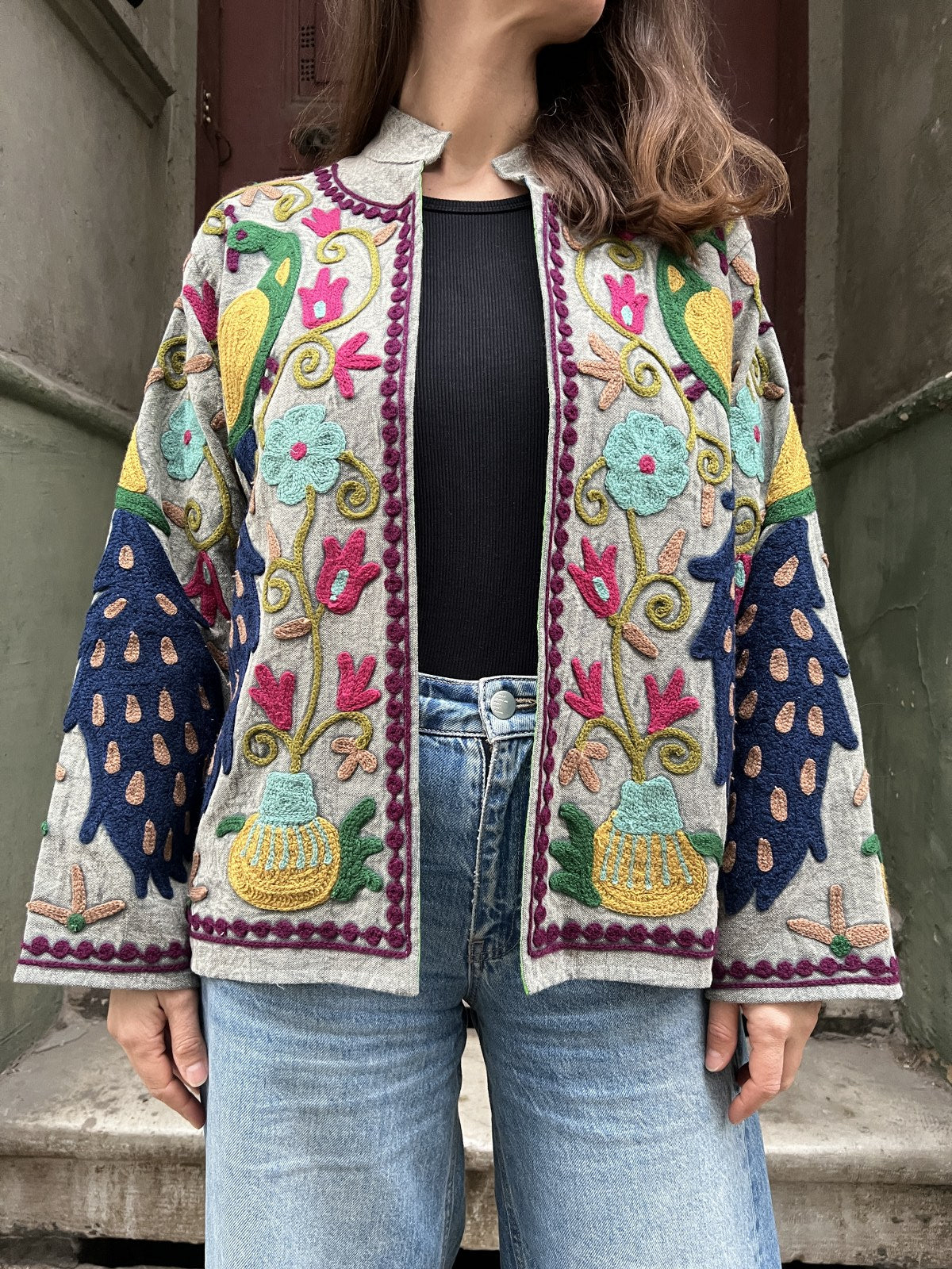 Bu Suzani işlemeli ceket, Orta Asya’dan günümüze uzanan geleneksel nakış sanatının modern bir yorumu olarak tasarlandı.