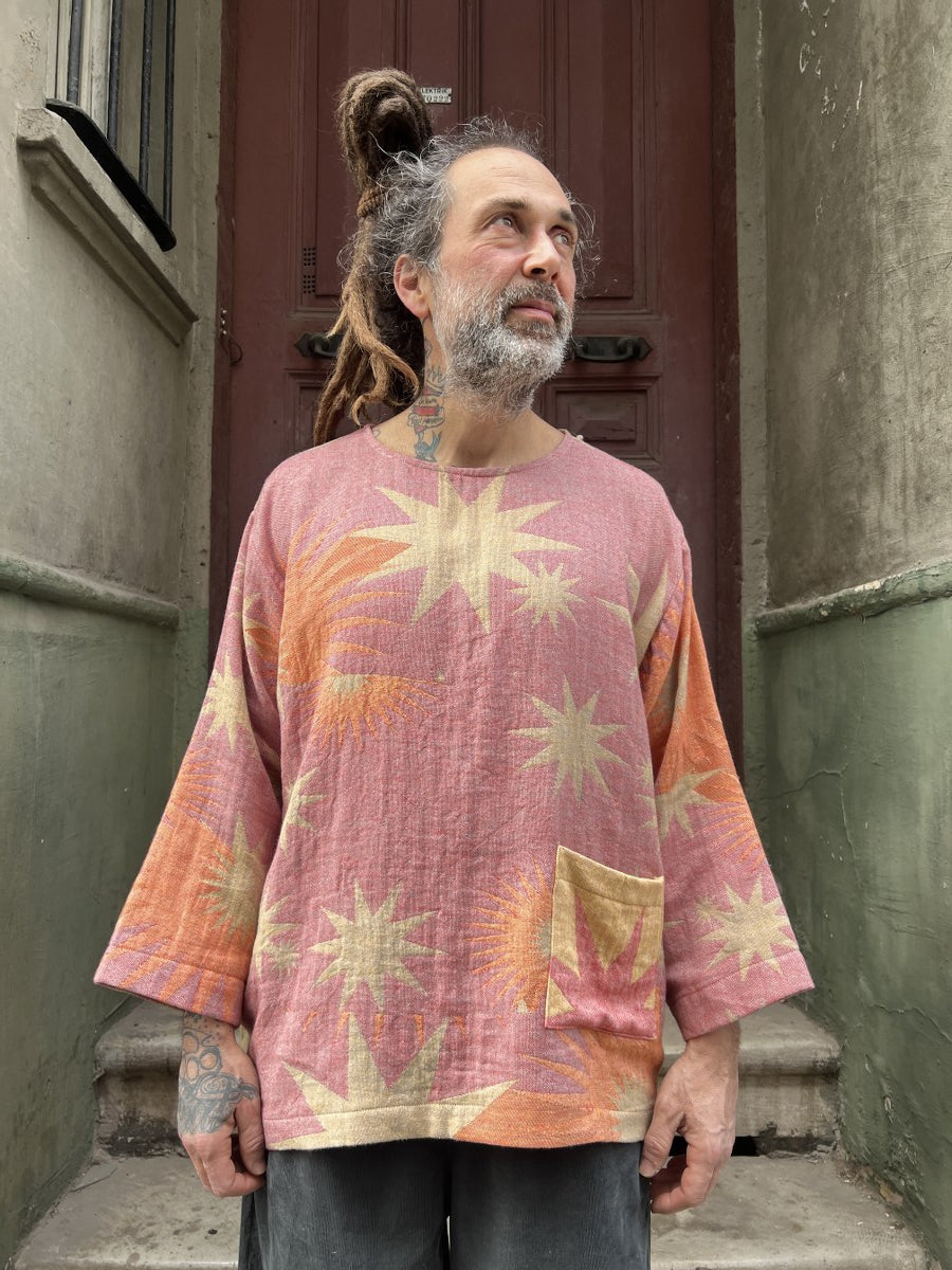 Turuncu–kırmızı güneş patlaması desenleri, bej tonlu ışık efektleri ve rahat kesimi ile hem sanatsal hem bohem bir görünüm sunar.